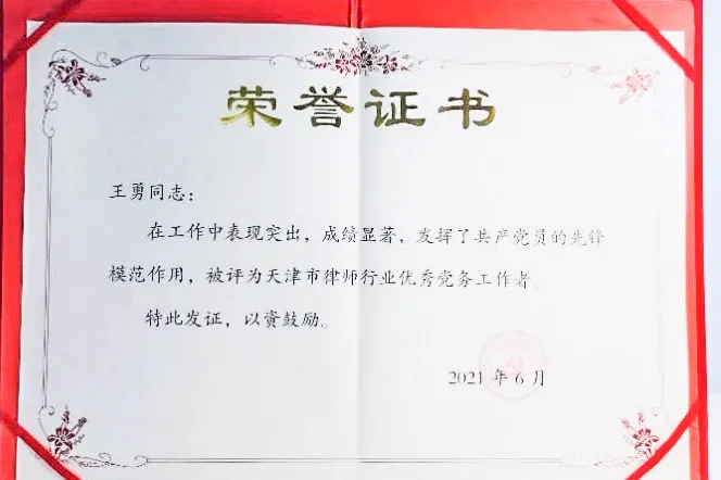 張永泉律師榮獲天津市律師行業“優秀共產黨員律師”榮譽稱號