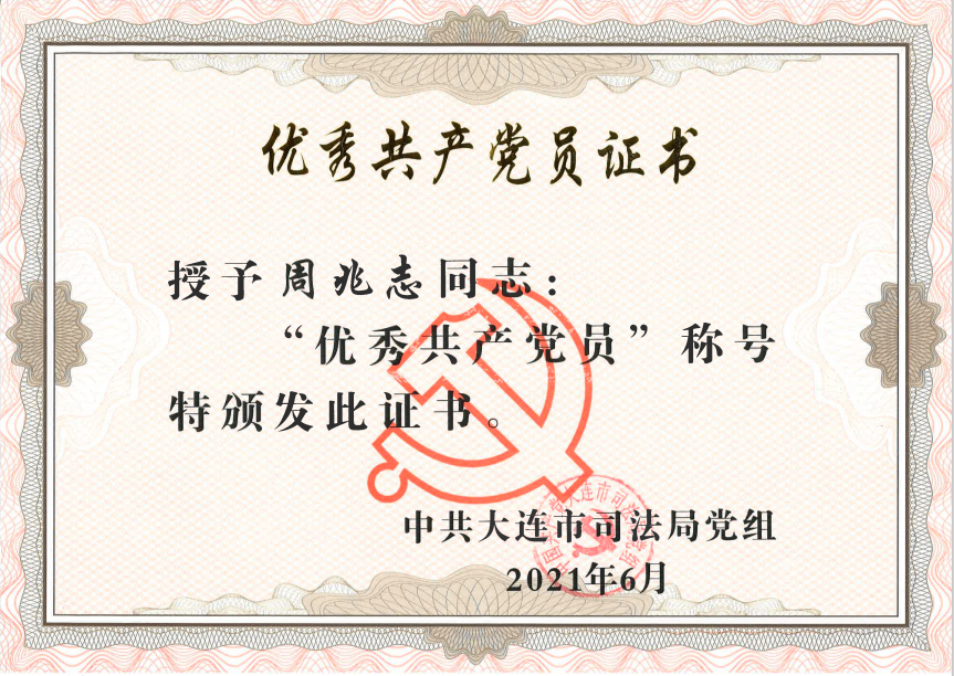 周兆志律師榮獲中共大連市司法局黨組“優秀共產黨員”榮譽稱號
