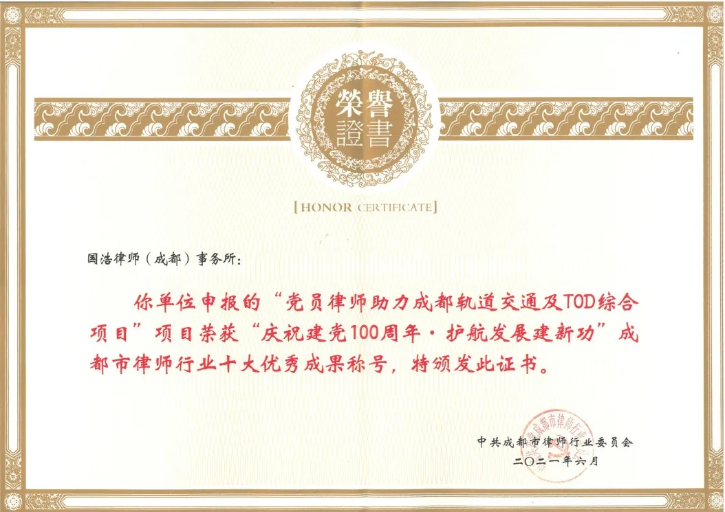 6月29日下午,由成都市委組織部、市司法局指導,市律師行業黨委、市律師協會承辦的“頌歌敬百年 砥礪新征程”主題成都市律師行業慶祝建黨100周年文藝匯演隆重舉行。活動發布了成都市律師行業“慶祝建黨100周年·護航發展建新功”十大優秀成果,國浩成都“黨員律師助力成都軌道交通及TOD綜合項目”成功入選。