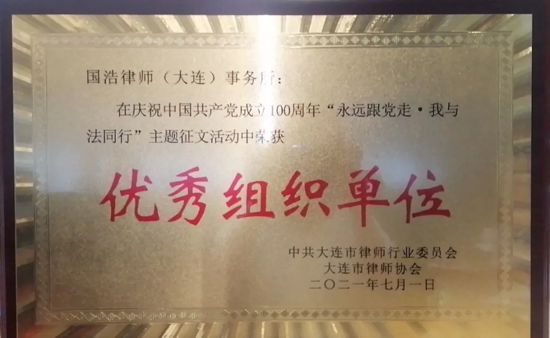 7月1日,在中共大連市律師行業委員會、大連市律師協會表彰慶祝中國共產黨成立100周年“永遠跟黨走?我與法同行”主題征文活動中,國浩大連榮獲“優秀組織單位”榮譽稱號。國浩大連合伙人田曉亮榮獲一等獎;國浩大連合伙人周兆志榮獲二等獎;國浩大連管理合伙人、主任張旭濤,合伙人王燦芝榮獲三等獎。