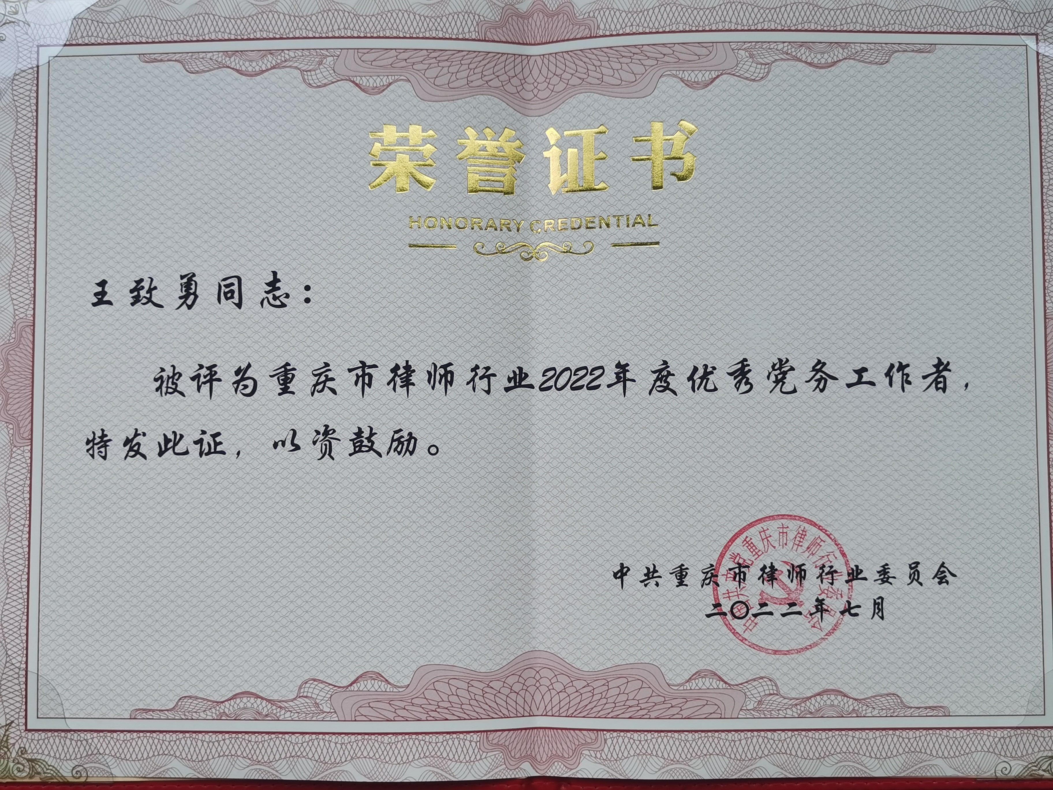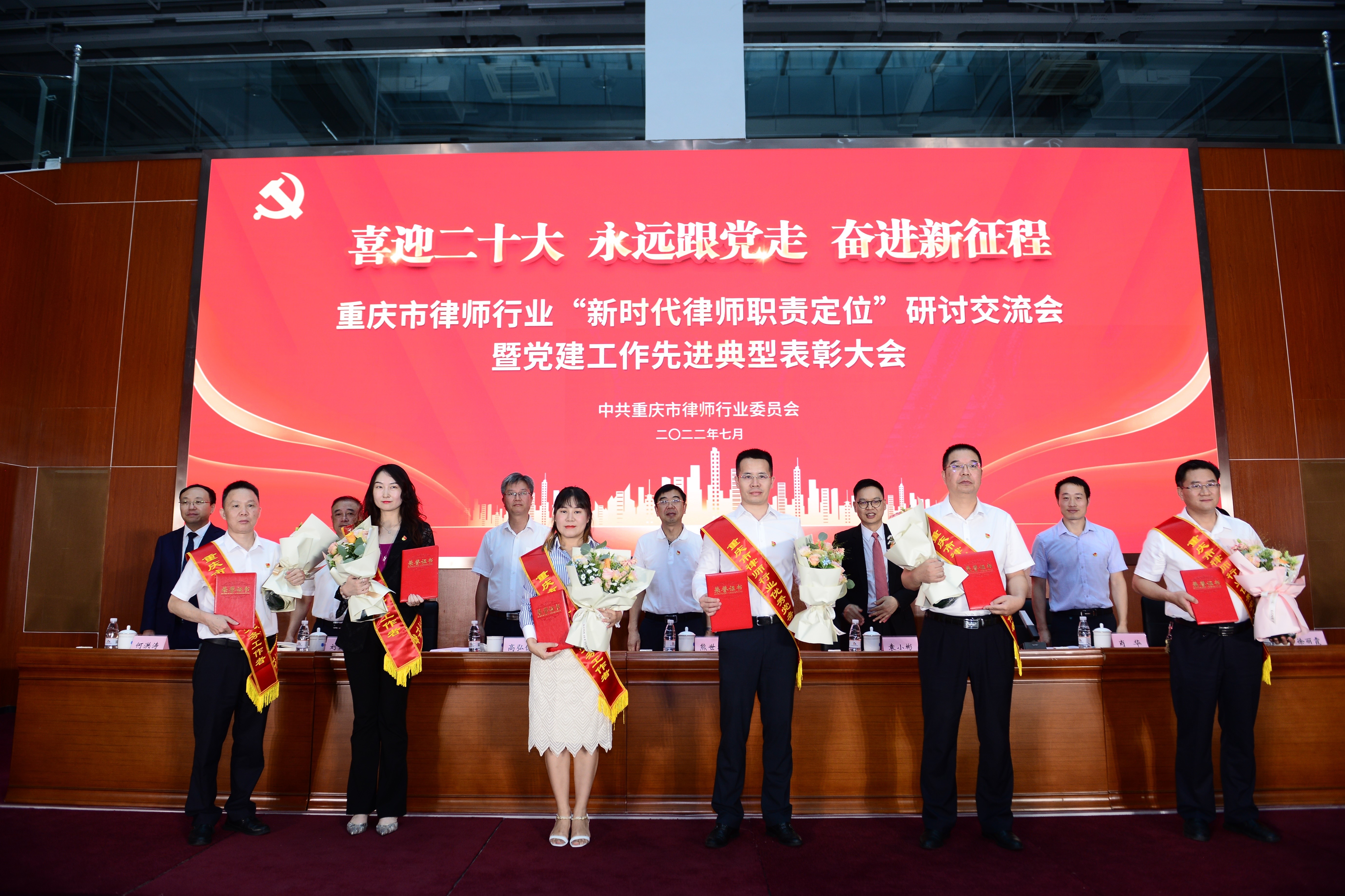 為全面貫徹落實黨的十九大和十九屆歷次全會精神,深入貫徹落實重慶市第六次黨代會精神,7月19日,在重慶市司法局黨委的領導下,重慶市律師行業黨委召開“喜迎二十大 永遠跟黨走 奮進新征程”——“新時代律師職責定位”研討交流會暨黨建工作先進典型表彰大會。會上,國浩重慶黨總支書記、合伙人王致勇榮獲了“重慶市律師行業2022年度優秀黨務工作者”榮譽稱號。