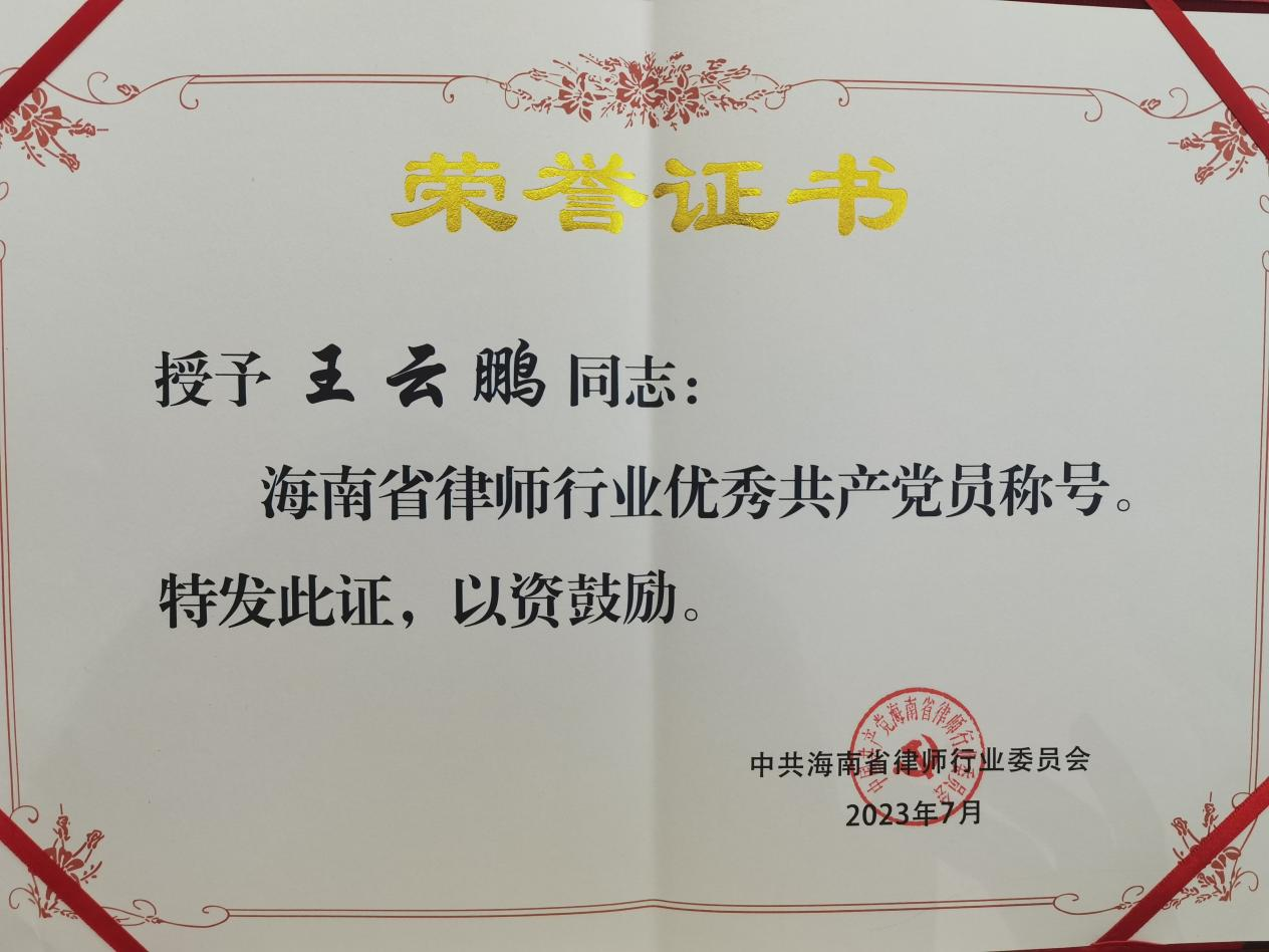 2023年7月12日,經(jīng)海南省律師行業(yè)黨委評選,國浩海南黨支部常務(wù)副書記、管理合伙人王云鵬榮獲2023年海南省律師行業(yè)“優(yōu)秀共產(chǎn)黨員”榮譽稱號。