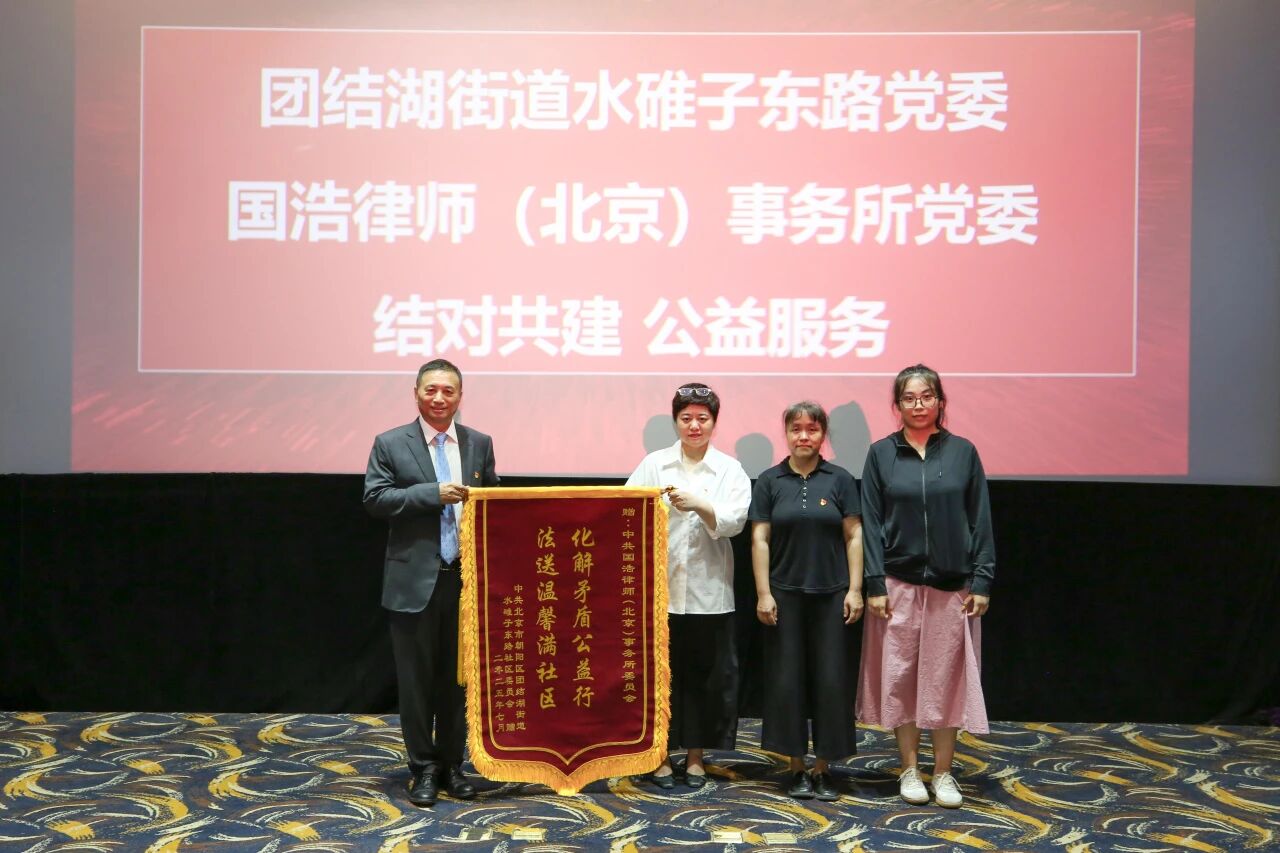 黨建共建結碩果,錦旗熠熠映初心。本次大會還特別設置了溫馨而莊重的“結對社區”授錦旗儀式。長期以來,國浩北京黨員律師們深入結對社區,積極開展義務司法調解、普法講座等志愿服務,切實解決了當地居民的法律難題,贏得了社區黨委的高度贊譽。結對社區代表朝陽區團結湖街道水碓子東路社區黨委副書記王建平同志、司法主任朱澤鴻同志親臨現場,將一面寫有“化解矛盾公益行,法送溫馨滿社區”的錦旗鄭重授予國浩北京黨委。