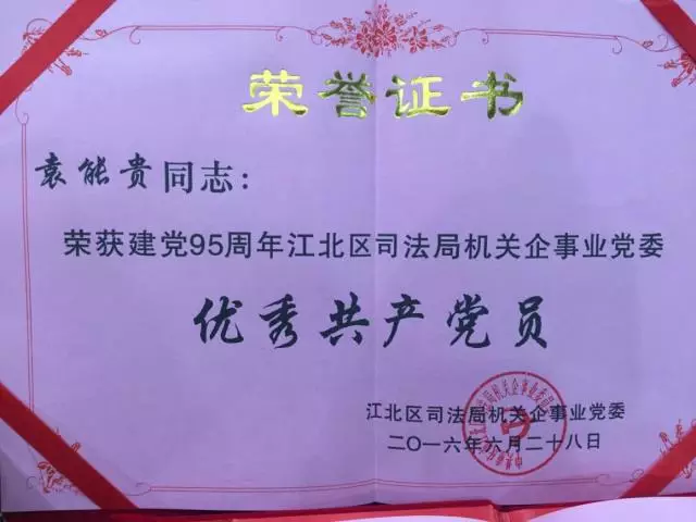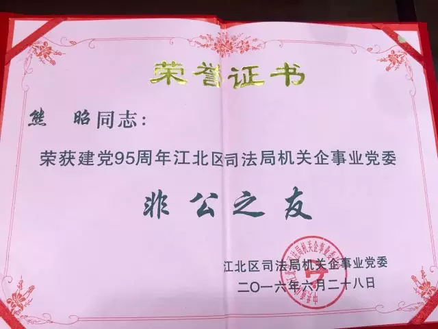 2016年6月28日,在重慶市江北區司法局機關企事業黨委“七一”表彰會上,國浩重慶辦公室管理合伙人熊昭、合伙人袁能貴分別被評為建黨95周年江北區司法局機關企業事業黨委“非公之友”和“優秀共產黨員”。