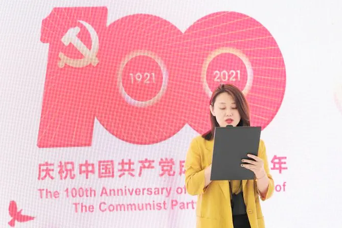 匯演開始前,全體參會人員觀看了重溫黨史100年紀錄片《光輝黨史 百年誕辰》。從1921到2021,從南湖的紅船到天安門上“中國人民站起來了”的高呼,再到全面建成小康社會,中國共產黨在憂患中誕生、成長、壯大的艱辛歷程看得大家內心火熱。隨后,在謝孟暉副書記的帶領下,全體黨員在莊嚴的黨旗下,重溫入黨誓詞,重憶入黨初心。