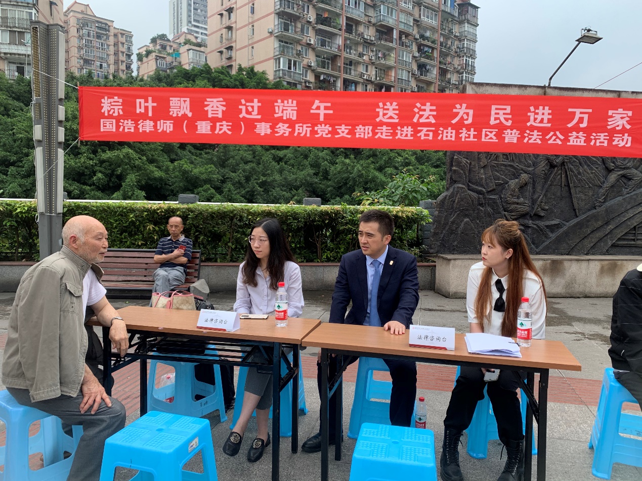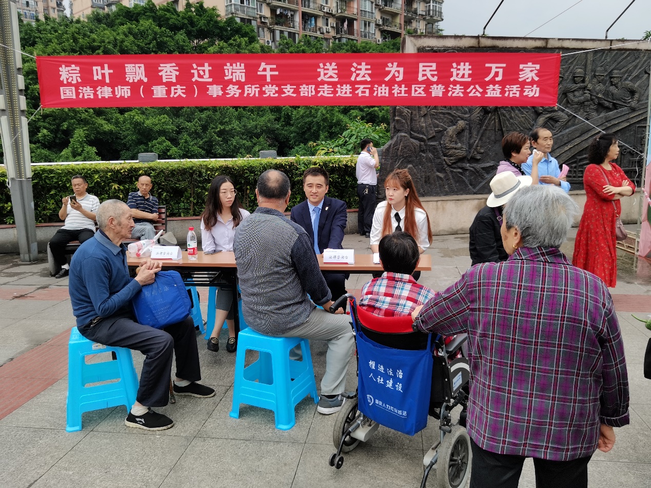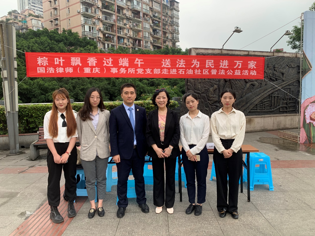 為持續開展“我為群眾辦實事”實踐活動,2021年6月10日端午節前,在國浩重慶黨支部、國浩重慶管委會的組織下,國浩重慶黨員律師黃鵬、律師張月琴和實習律師劉杰思、蘭一新等走進重慶市江北區大石壩街道石油社區,開展了“粽葉飄香過端午,送法為民進萬家”公益普法宣傳活動,為社區居民送上“端午節法治大禮包”。