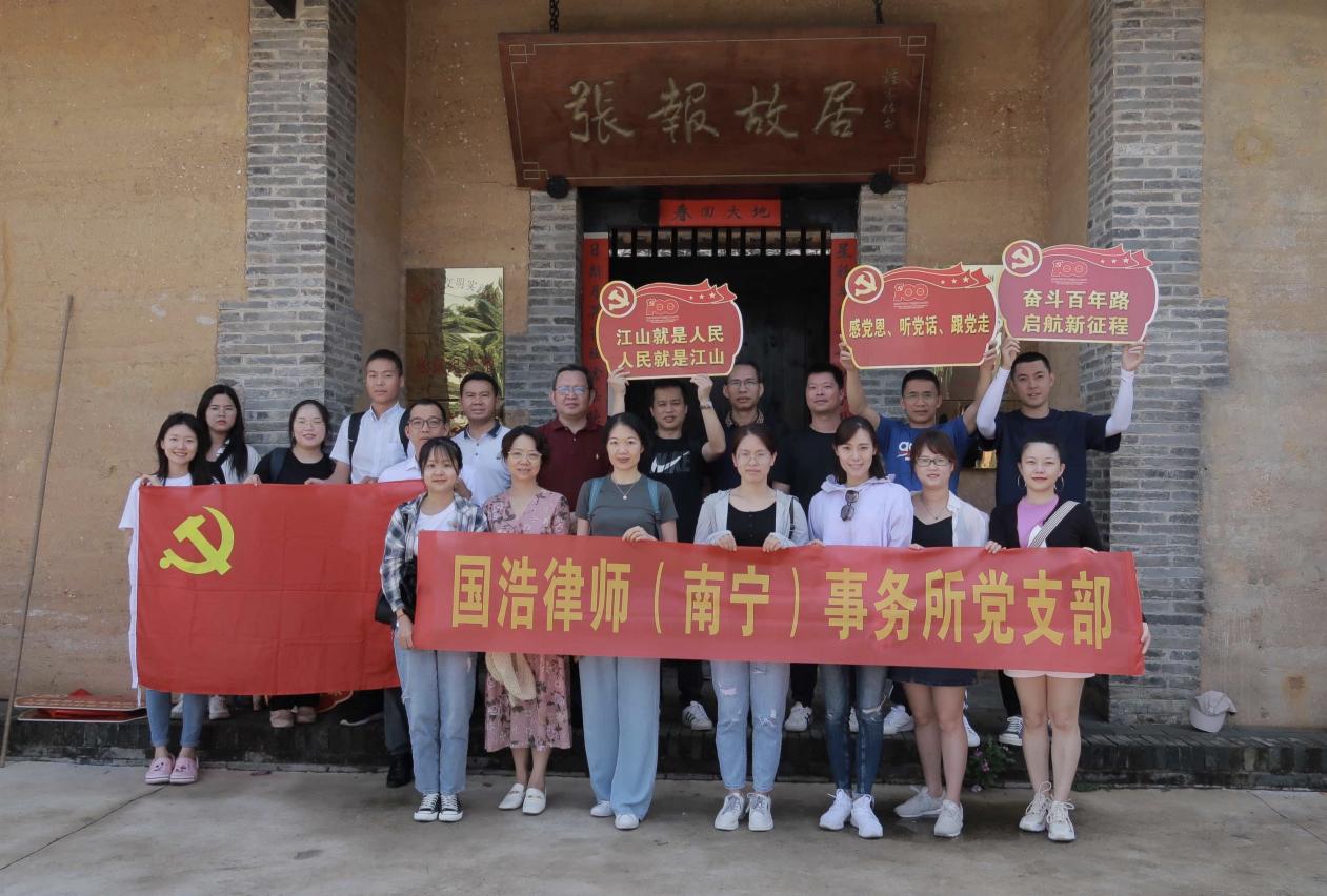 2021年6月27日,國浩南寧黨支部組織國浩南寧管理合伙人、黨支部書記李林輝,合伙人朱繼斌等全體成員前往廣西扶綏縣張報、吳西故居,開展了以“參觀英雄故居,汲取紅色精神”為主題的黨史學習教育活動,通過“打卡”紅色教育基地的形式,緬懷革命先烈,重溫百年黨史,接受革命精神洗禮和愛國主義教育。