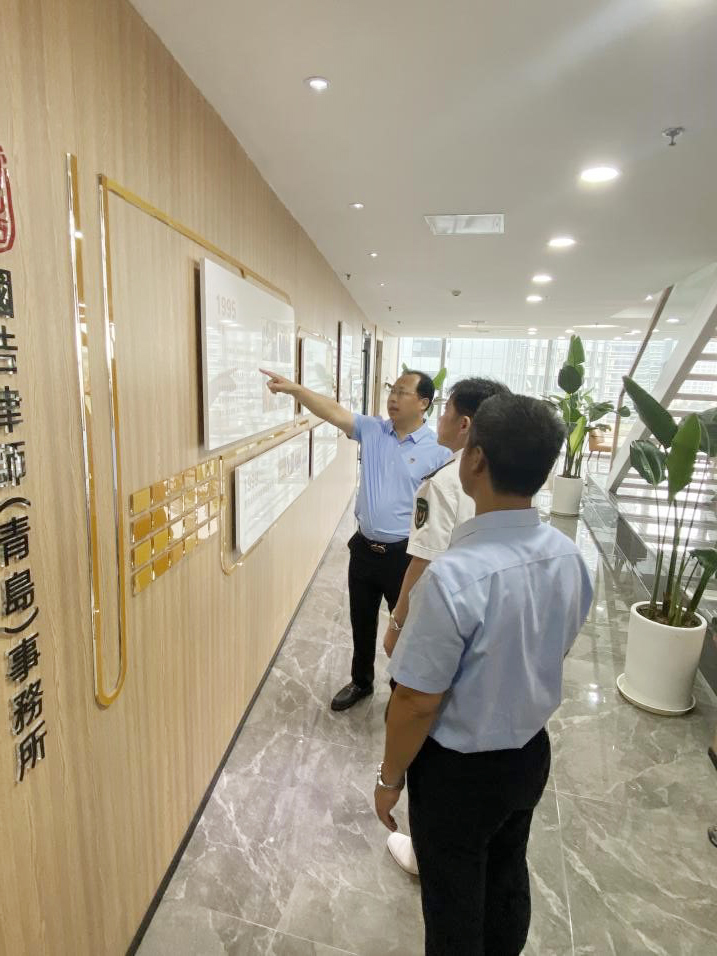 隨后,國(guó)浩青島黨支部接受了青島第八干休所的贈(zèng)書(shū),并帶領(lǐng)青島第八干休所領(lǐng)導(dǎo)一行進(jìn)行參觀。在國(guó)浩青島的歷程墻、文化墻、榮譽(yù)墻前,王振寶書(shū)記、彭山嶺律師向領(lǐng)導(dǎo)一行詳細(xì)介紹了國(guó)浩青島的發(fā)展歷史與內(nèi)部文化建設(shè)工作最新進(jìn)展,雙方在交流中就開(kāi)展下一階段共建活動(dòng)進(jìn)行了商議與安排。