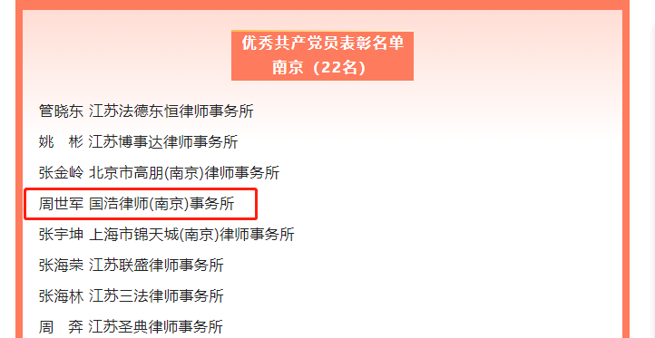 國浩南京黨委積極參與江蘇省、南京市律協“兩優一先”評選工作,6月30日,國浩南京管理合伙人、黨委副書記周世軍榮獲“江蘇省律師行業優秀共產黨員”榮譽稱號。通過選樹先進典型,激勵士氣、鼓舞干勁,繼續弘揚黨的優良傳統,保持和發揚黨的先進性,迎接新挑戰,啟航新征程。
