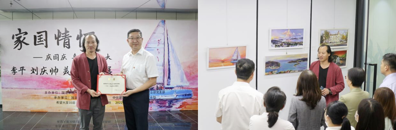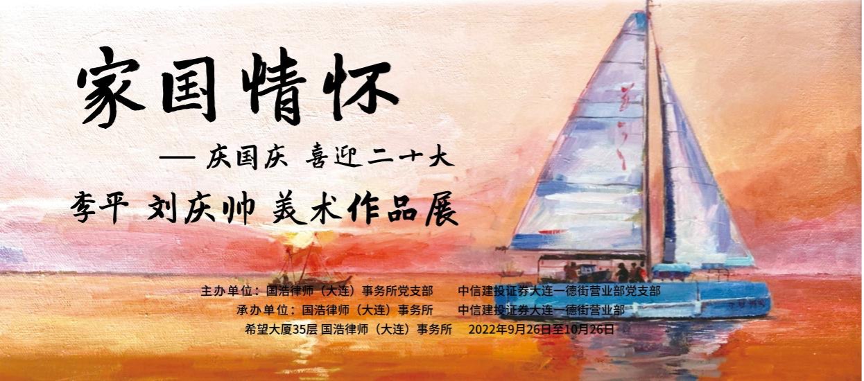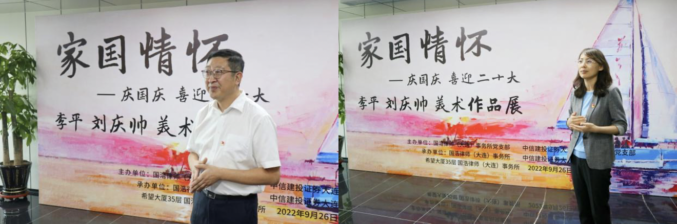 為慶祝祖國(guó)73周歲華誕,喜迎二十大勝利召開(kāi),豐富國(guó)浩大連全體人員的文化生活,2022年9月27日下午,國(guó)浩大連黨支部聯(lián)合中信建投證券大連一德街營(yíng)業(yè)部黨支部,在國(guó)浩大連辦公室會(huì)議室舉辦了“家國(guó)情懷——慶國(guó)慶、喜迎二十大”主題美術(shù)作品展,特邀展出了中國(guó)美術(shù)家協(xié)會(huì)會(huì)員、北京大學(xué)藝術(shù)學(xué)院客座教授李平和中國(guó)畫(huà)家協(xié)會(huì)理事、徐悲鴻藝苑特邀畫(huà)家劉慶帥的經(jīng)典畫(huà)作。國(guó)浩大連黨支部書(shū)記、管理合伙人、主任張旭濤主持了開(kāi)幕儀式,中信建投證券大連一德街營(yíng)業(yè)部總經(jīng)理馬文睿出席了活動(dòng)。