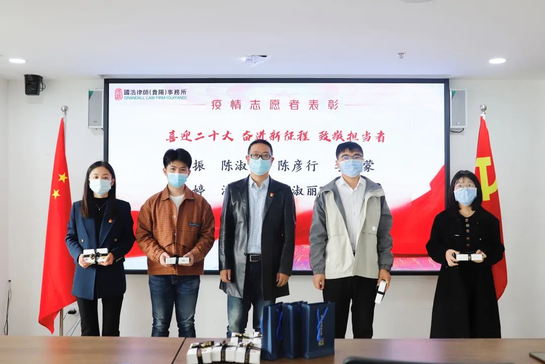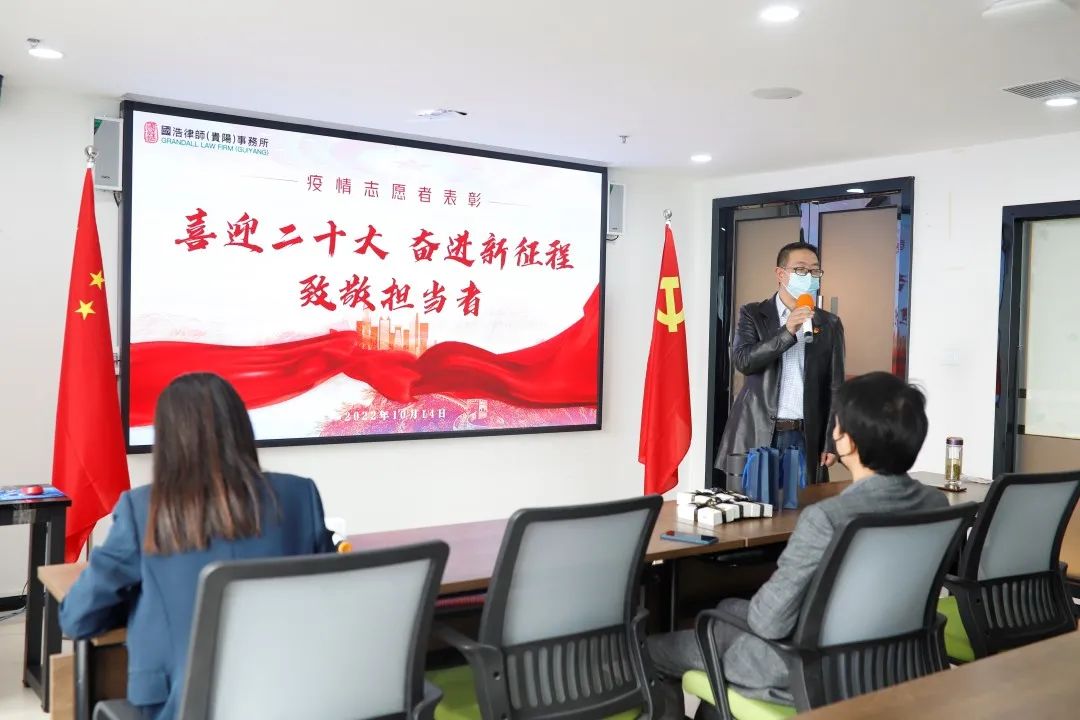 國浩貴陽黨支部統戰委員、合伙人楊波為疫情期間積極參加轄區抗疫的11名志愿者頒發了紀念品和志愿者補貼金,并號召全體國浩貴陽律師向志愿者學習,國浩貴陽黨員律師要模范帶頭,在急難險重任務中挺身而出、主動作為,切實發揮“平常時候看得出來、關鍵時刻站得出來、危難關頭豁得出來”的引領作用,以更加奮發向上的姿態建功新時代、奮進新征程。