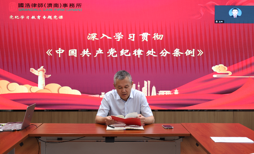 隨后,國浩濟南黨委書記、國浩執行合伙人鄭繼法以黨紀學習教育為主題為大家上了一堂紀律黨課,他強調,各支部要就今年開展的《中國共產黨紀律處分條例》學習,進一步加強政治責任意識、紀律規矩意識、廉潔自律意識等內容的學習,以《中國共產黨紀律處分條例》要求為準繩,使廉潔自律規范內化于心、外化于行,堅定理想信念,增強宗旨意識,嚴守國家法律法規,守住紀律“底線”,認真履職盡責。在學習過程中,黨員們認真聽講、積極思考,對條例中的各項規定進行了深入的理解和掌握。