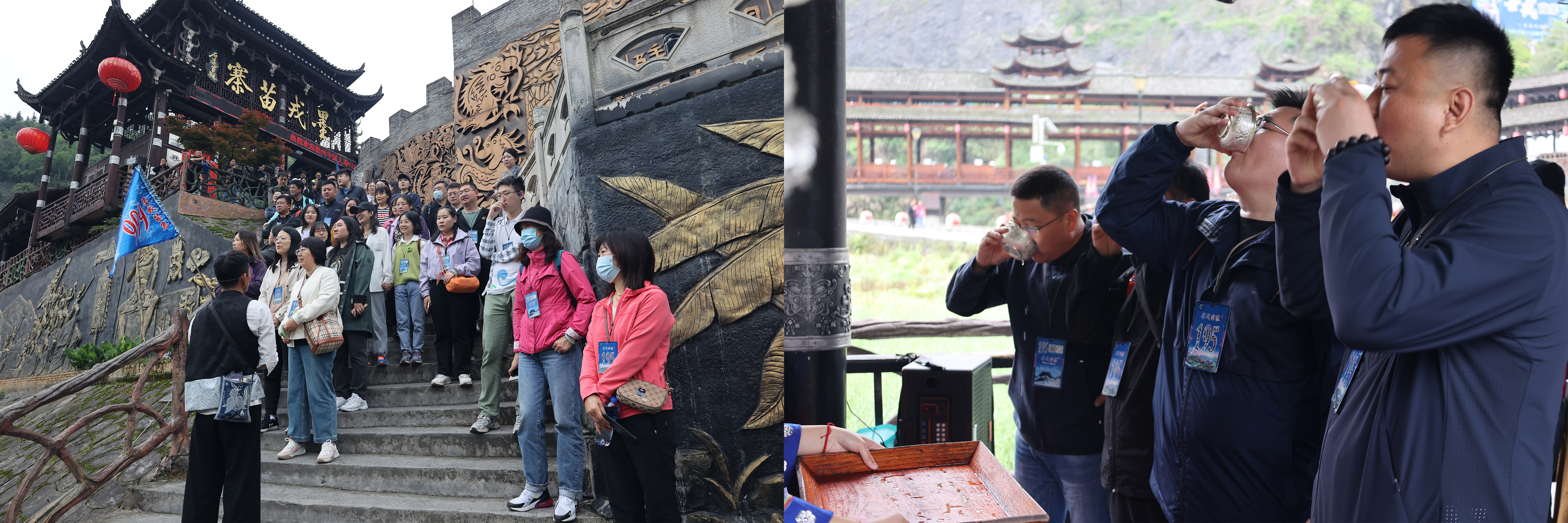 邁入墨戎苗寨,一片依山而建的房屋,錯落層疊有致的往山坡上爬去,青瓦、木屋、吊腳樓、從地面蔓延到山崖。國浩濟南黨員們體驗了在寨門風雨廊橋上對歌,喝攔門酒,充分感受苗族風情。