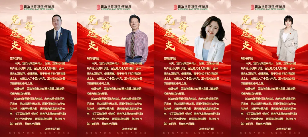 此外,值得一提的是,在“七一”建黨節(jié)當(dāng)日,國(guó)浩海南黨總支向每位黨員發(fā)送了專(zhuān)屬版節(jié)日寄語(yǔ)。寄語(yǔ)中深情回望了與每一位黨員并肩奮斗的逐夢(mèng)征程,并號(hào)召全體黨員“繼續(xù)以法治信仰為帆,在維護(hù)公平正義的航道上破浪前行;以團(tuán)隊(duì)智慧為槳,在服務(wù)自貿(mào)港建設(shè)的浪潮中凝聚合力。錨定遠(yuǎn)方,奮楫爭(zhēng)先,共同駛向更高更遠(yuǎn)的彼岸,在法治中國(guó)建設(shè)的壯闊畫(huà)卷上,書(shū)寫(xiě)國(guó)浩律師(海南)事務(wù)所的時(shí)代華章!”