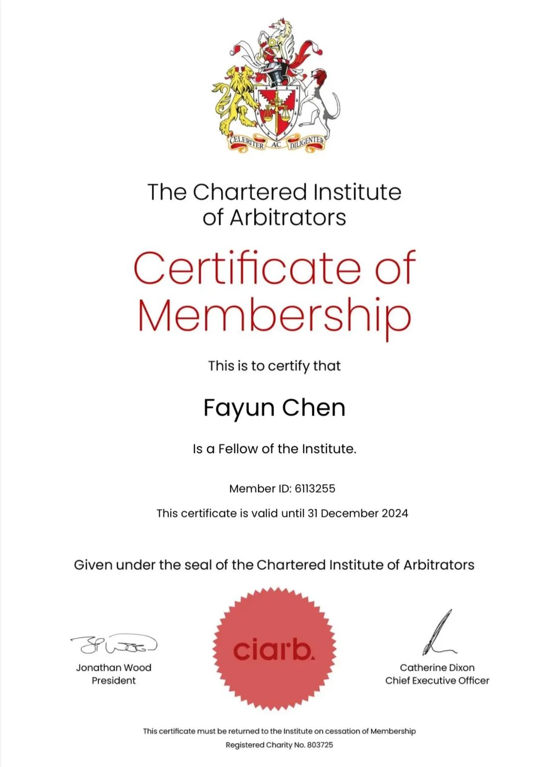 On 14 February 2024, Walter Fayun CHEN, partner of Grandall Nanjing, officially achieved the Fellow of the Chartered Institute of Arbitrators, a high recognition from one of the world’s leading professional bodies for dispute avoidance and dispute management. With extensive experience in dispute resolution, Walter has been admitted as an arbitrator by a number of well-known arbitration institutions, including without limitation, the London Court of International Arbitration (LCIA), Singapore International Arbitration Center (SIAC), Hong Kong International Arbitration Centre (HKIAC), Thailand Arbitration Center (THAC), China International Economic and Trade Arbitration Commission (CIETAC), China Maritime Arbitration Commission (CMAC), Beijing International Arbitration Center (BIAC) and Shanghai Arbitration Commission.