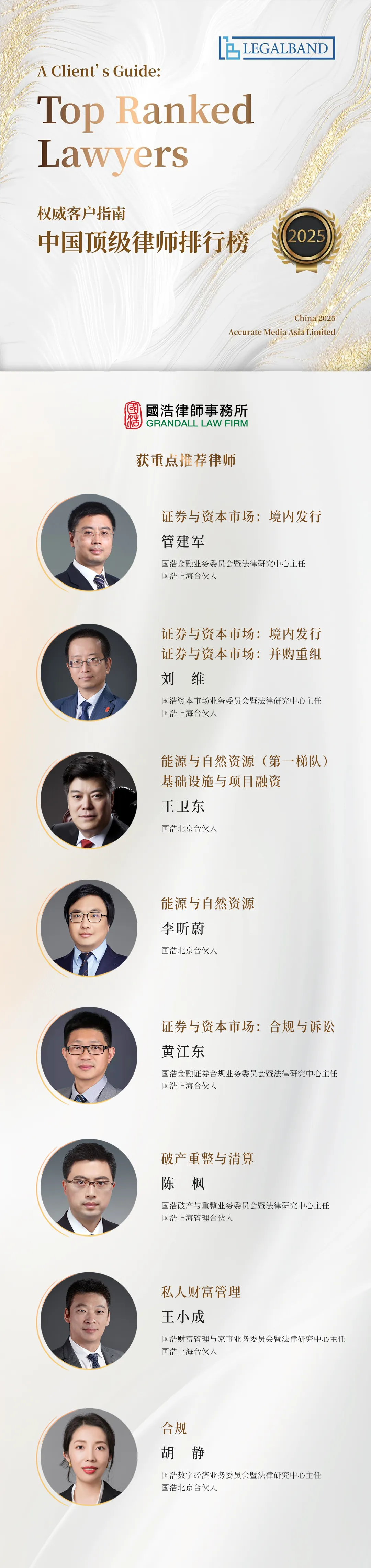 On 22 April 2025, LEGALBAND, a renowned legal rating agency, announced the 2025 LEGALBAND Top Ranked Law Firms and Top Ranked Lawyers. Grandall has been honored the Top Ranked Law Firm for exceptional performance in the market. Specifically, in the Securities and Capital Markets: Domestic Issuance, it has been recommended as First Tier for seven consecutive years while the ranking in the Bankruptcy Reorganization and Liquidation has been promoted to the Second Tier. Compliance and Real Estate and Construction have newly made the list.