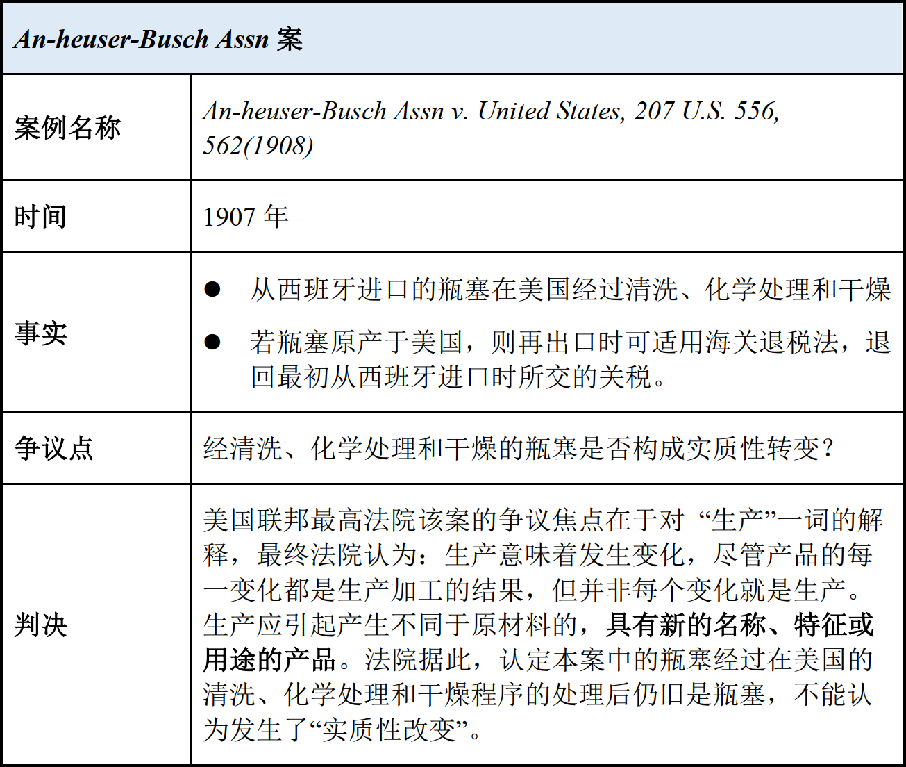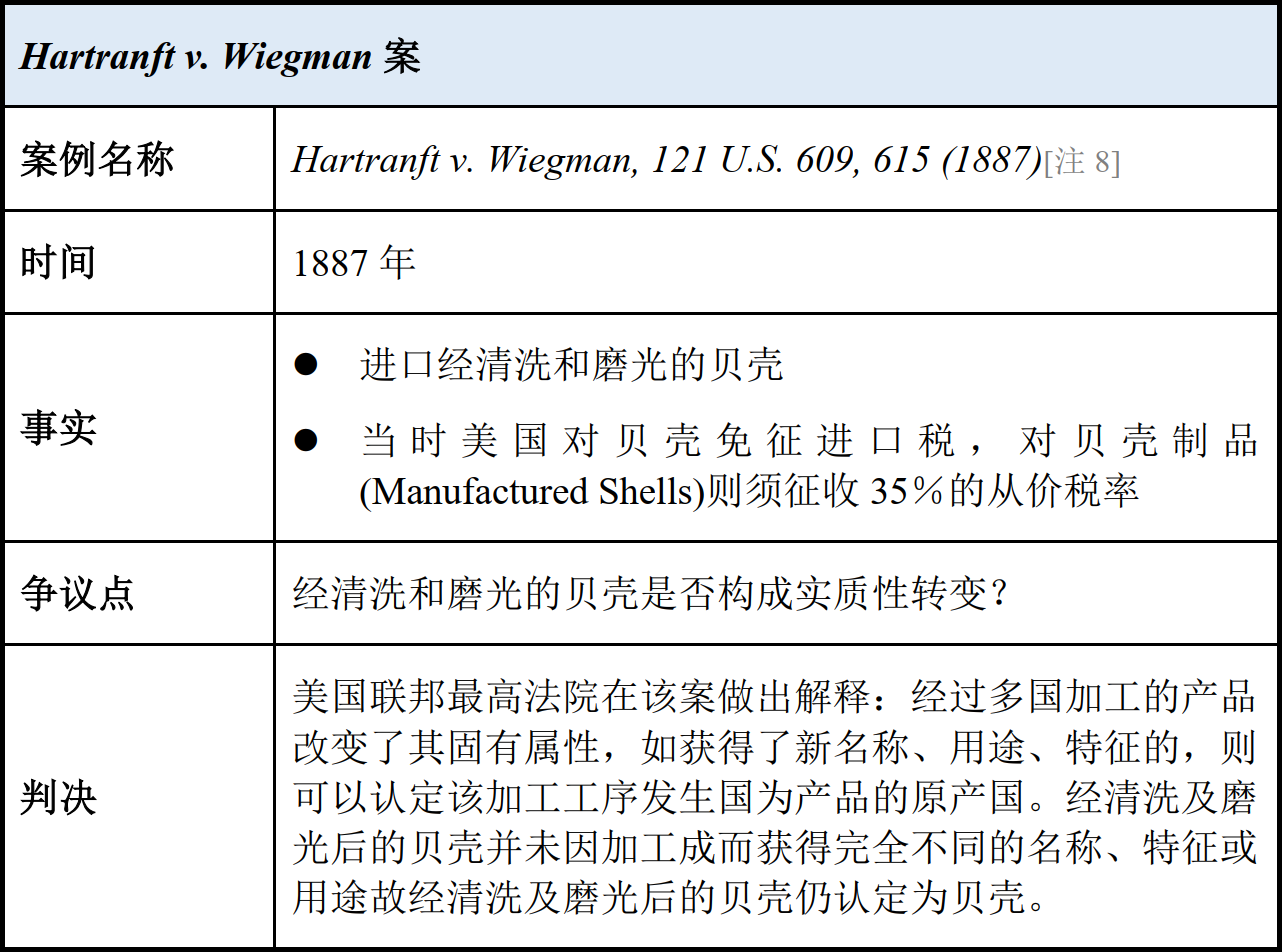 其他經典司法案例也對“實質性改變”進行了進一步的闡述,如Gibson-Thomsen案中若成品變成了新物品的一部分并且擁有了新的名稱、性質和用途,則發生了“實質性改變”[注9];Uniroyal案中若成品存在一些核心原材料或零部件,并在制造、加工、組裝之前就已經具備了成品的最終尺寸、形狀和形態,則概率會認定成品原產地是這些核心原材料或零部件的生產地[注10];Energizer Battery案中若成品或其組件在進口時具有預先確定的最終用途,并進口后的組裝過程而沒有發生用途變更,則不構成“實質性改變”[注11]。