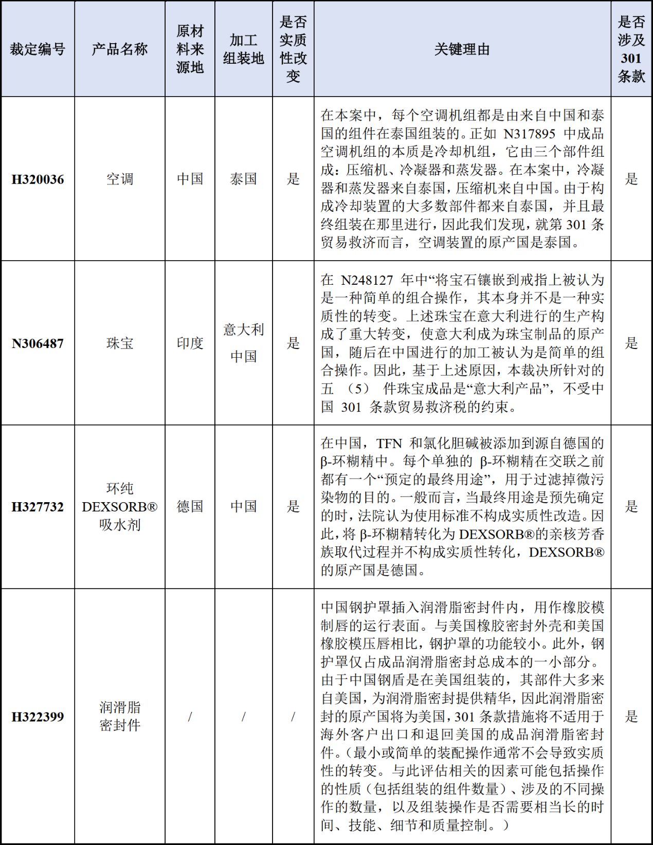 CBP在判斷是否對產品依據301條款加征關稅時,也依照“實質性改變”標準進行。筆者通過檢索美國海關裁定在線搜索系統(Customs Rulings On-line Search System,下稱“CROSS”)[注12],檢索到一些和301條款相關的原產地預裁定。