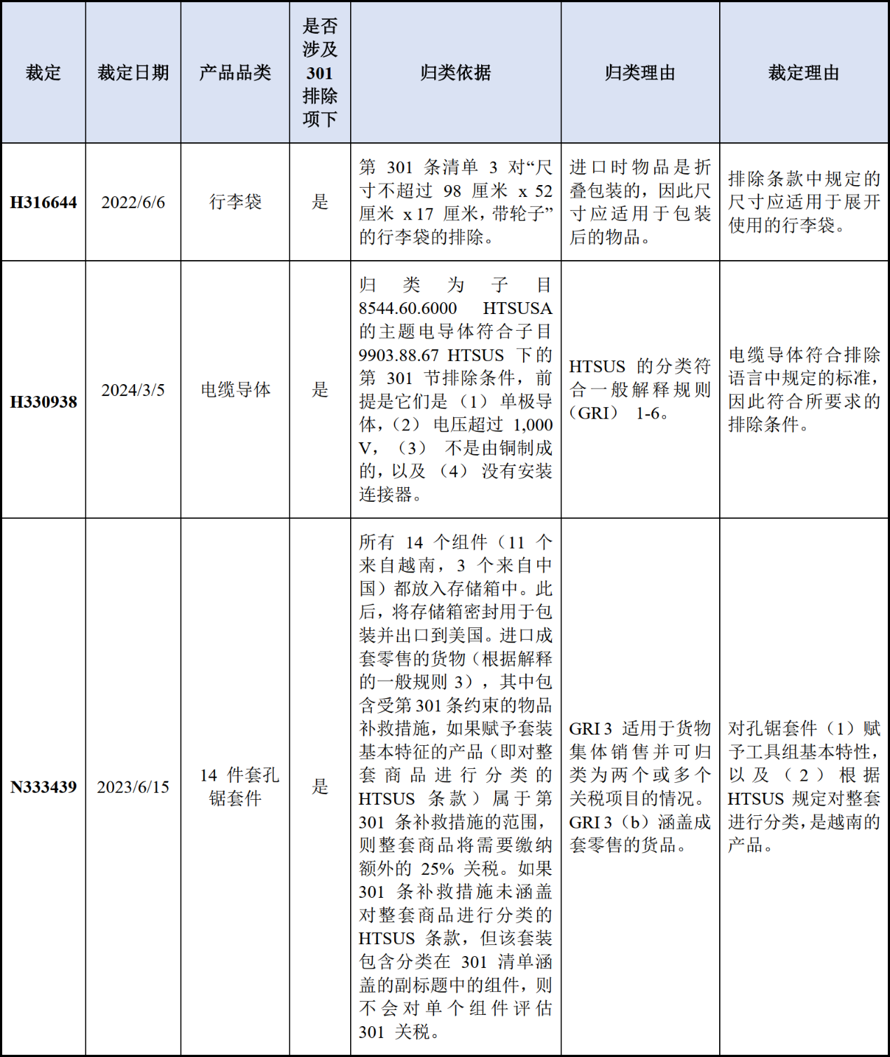 為規避額外關稅的征收,出口企業應努力確保其商品被歸類于《301調查報告》的排除項下或被歸類于《301調查報告》中未被加征關稅的子目或品目。對于前者,筆者通過CROSS檢索到近年來涉及《301調查報告》排除項下的商品歸類預裁定案例。