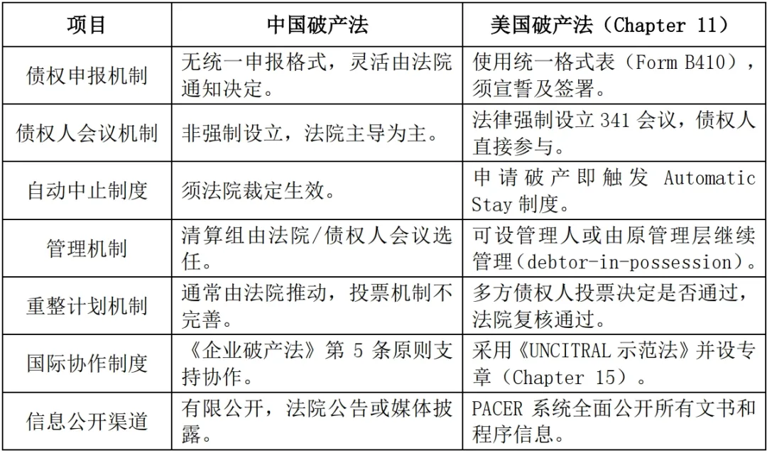 (三) 美國破產程序與中國破產制度的主要差異