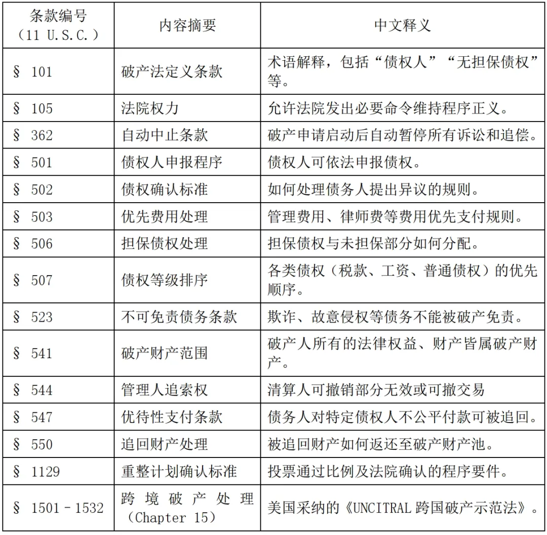 附錄四:常用美國破產法條款對照表(精選15條)