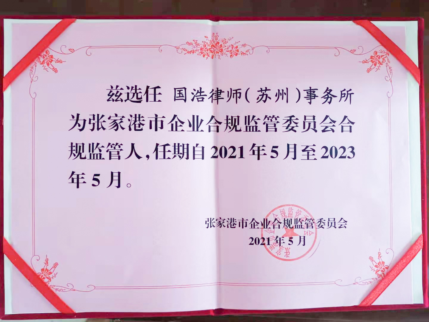 目前,國浩蘇州獲聘“張家港市企業(yè)合規(guī)監(jiān)管委員會合規(guī)監(jiān)管人”,并專門設置了“合規(guī)監(jiān)管人部”,為合規(guī)監(jiān)管提供法律保障。會后,國浩蘇州律師表示將盡己所能協(xié)助“張家港市企業(yè)合規(guī)監(jiān)管委員會”做好企業(yè)合規(guī)監(jiān)管職責。