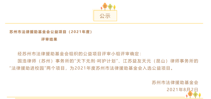 為深入開展法援惠民生活動,2021年8月2日,國浩蘇州辦公室的“天下無刑·呵護計劃”項目成功入選2021年度蘇州市法律援助基金會公益項目。