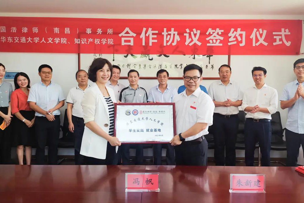 2021年9月18日,在華東交通大學(以下簡稱“華東交大”)建校50周年之際,國浩律師(南昌)事務所與華東交大知識產權學院舉行了戰略合作協議簽約暨學生實踐就業基地授牌儀式。華東交大副校長楊輝,知識產權學院院長朱新建,院黨委書記黃瑜、副書記裘德才,副院長吳昌林、張祥志、肖海等領導,以及國浩執行合伙人、國浩南昌管理合伙人、主任馮帆,國浩南昌黨支部書記張帆、副書記蔡明,合伙人戴高翔等出席了儀式,并就開展人才培養、學術交流、課題研究、實踐就業基地、資源共享及教育基金等事宜進行了深入洽談。