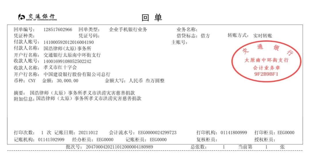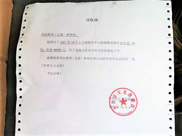 得知受災地區(qū)情況緊急、多地救援設(shè)備短缺,國浩太原辦公室迅速組織發(fā)起了“關(guān)于山西遭遇重大洪澇災害的捐款倡議”活動,建立物資捐贈渠道,呼吁國浩太原全體員工積極參與募捐活動,共克時艱。征集倡議活動發(fā)起后獲得了大家的積極響應,用每個人的一點溫暖,聚集成暴雨中一片有愛的天空。截至目前,國浩太原已向受災區(qū)域支援了8萬元的捐款及物資,并發(fā)揮自身專業(yè)所長為受災人民提供優(yōu)質(zhì)的公益法律服務。