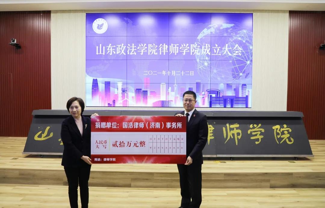 成立大會上,國浩濟南與山東政法學院簽訂了建設協(xié)議書,并捐贈二十萬元作為首批建設資金。山東政法學院律師學院采取“1+N+N”運行模式,基于學校和山東省律師協(xié)會的合作協(xié)議,學校對接N個律師事務所,分別開設N個專業(yè)特色培養(yǎng)班,各班次采取微專業(yè)辦學模式,面向法學專業(yè)高年級學生、研究生和社會律師招生,旨在推動山東政法學院和律師行業(yè)實現(xiàn)產(chǎn)教融合、協(xié)同育人,推進法治人才培養(yǎng)關口前移。