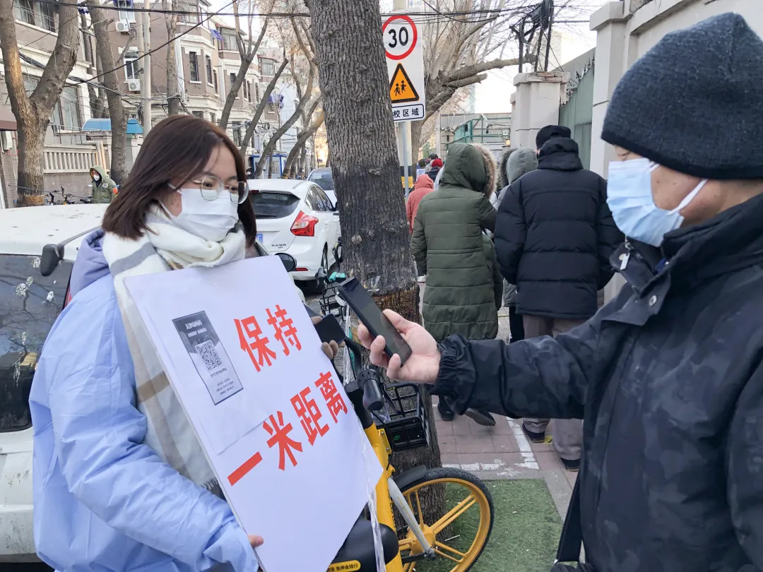 1月10日清晨6點,7名國浩天津律師頂著寒風高舉提示牌,耐心地引導著前來參加天津市第一輪核酸篩查的市民們。他們分組上崗,分工有序,有條不紊地疏通并安撫著排隊人員,不間斷地提醒著市民“保持排隊一米間距”“掃碼注冊”“帶好口罩,掃碼測溫”,同醫護人員們一起奮戰至深夜。