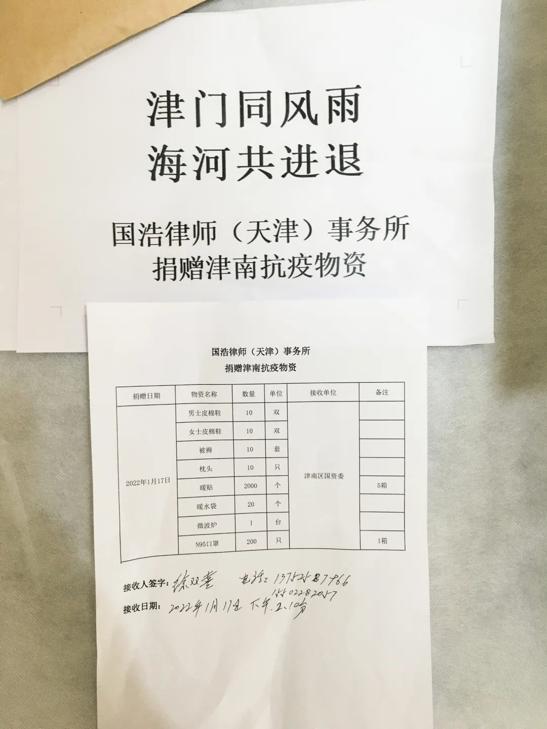 1月16日晚,國浩天津黨總支、國浩天津管委會共同發起了“津門同風雨,海河共進退”天津抗疫捐款,僅一晚上就募集了25,260元善款,并立即用其緊急采購了被褥、N95口罩、暖貼、棉鞋、暖水袋等抗疫物資。1月17日中午,這批物資就在劉道光律師和國浩天津黨務專員王勇的接力下,迅速定向送往了天津疫情高風險地區的天津市津南區人民政府國有資產監督管理委員會對接處,用于幫助其安頓支援高風險地區的各地志愿者。