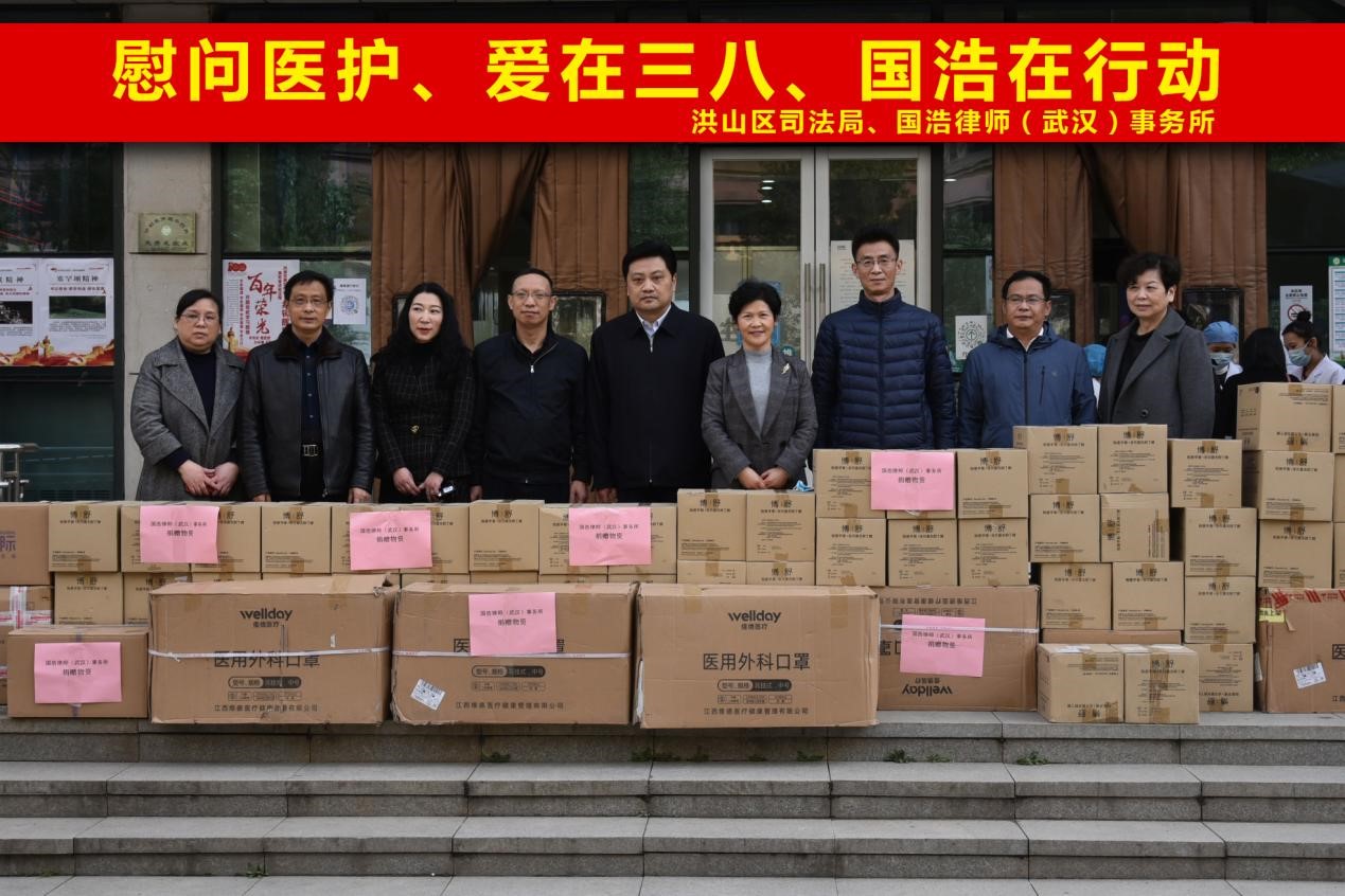 在此次武漢疫情防控關鍵時期,又值三八節到來之際,國浩武漢于2022年3月7日積極響應武漢市洪山區司法局的號召,向武漢科技大學德康醫院捐贈了20000只口罩,60000只檢查手套,200份護手霜禮盒,折合人民幣共計21338元,勇于履行社會責任,為武漢疫情防控工作貢獻一份力量。