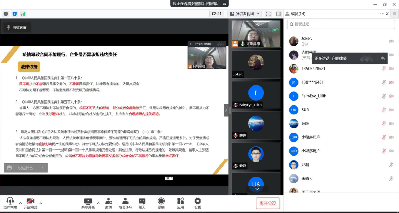活動中,齊鵬律師從新冠疫情這一不可抗力因素切入,以新冠疫情給企業(yè)日常經(jīng)營造成的影響為視角,圍繞企業(yè)經(jīng)營過程中常見的合同履行及違約責任承擔問題,以案釋法,為企業(yè)厘清不可抗力因素導(dǎo)致合同不能履行情形下的違約責任免除與承擔的內(nèi)在關(guān)系與區(qū)別,以及疫情期間關(guān)于房屋租金減免的法定情形,并對最高人民法院發(fā)布的相關(guān)指導(dǎo)意見進行一一剖析和解讀。