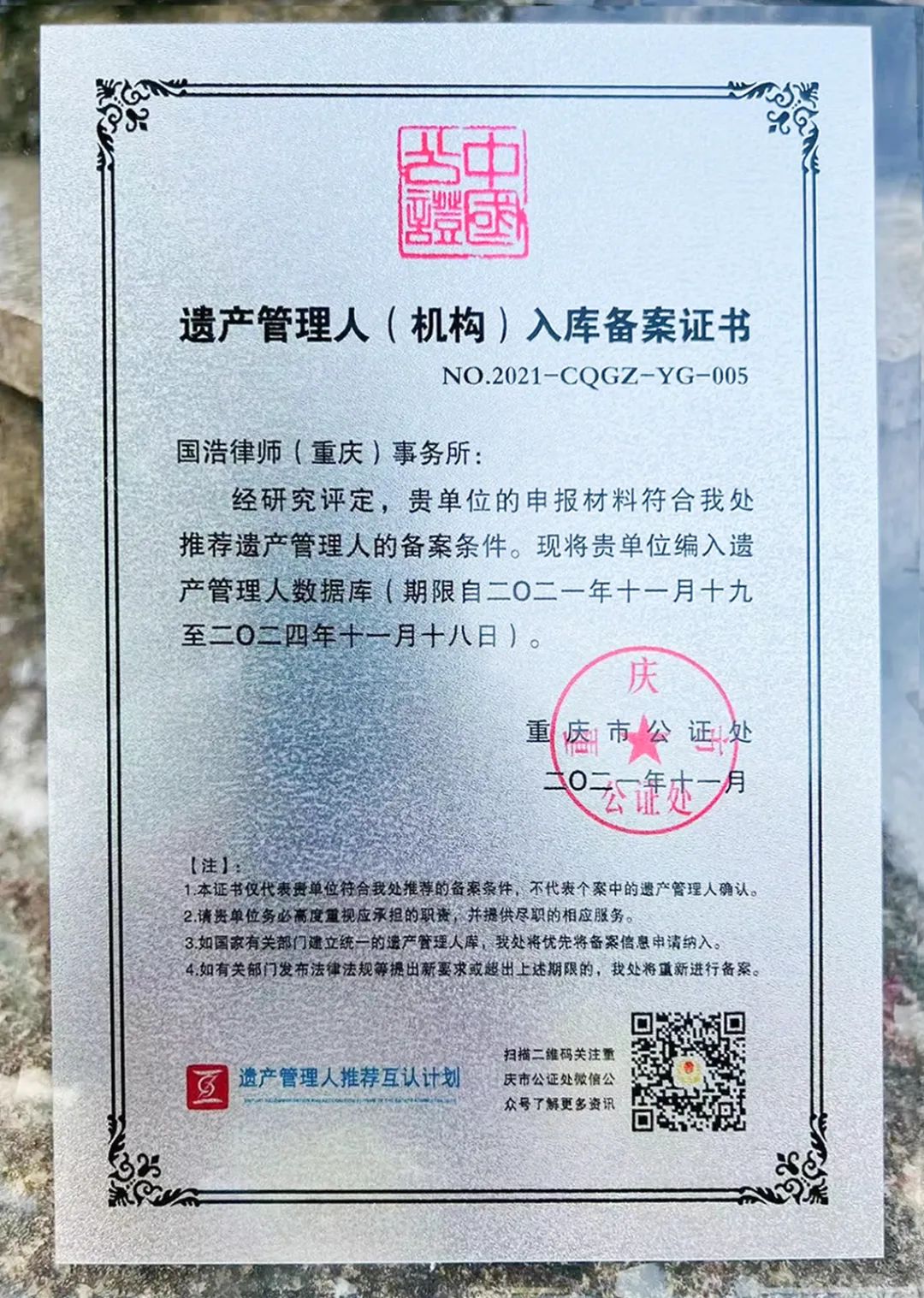 本次國浩重慶入選首批“遺產管理人數據庫”入庫機構,是對國浩重慶提供法律服務能力的認可。國浩重慶作為首批參與到遺產管理人中的機構,肩負著推動法治建設事業高質量發展的責任。國浩重慶律師們將爭作新時代的法治推動者,以更加蓬勃的姿態,在遺產管理領域打開新的局面,展現國浩重慶律師的專業與時代擔當。