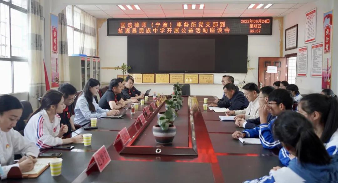 6月24日,國(guó)浩寧波黨支部一行在國(guó)浩寧波黨支部書記、合伙人方坤富的帶領(lǐng)下,來(lái)到鹽源縣民族中學(xué)實(shí)地走訪并開展交流座談會(huì)。校黨委書記、校長(zhǎng)胡聰元,校黨委委員、副校長(zhǎng)代軍偉,校資助辦主任劉德華,相關(guān)老師以及受助學(xué)生參加會(huì)議。