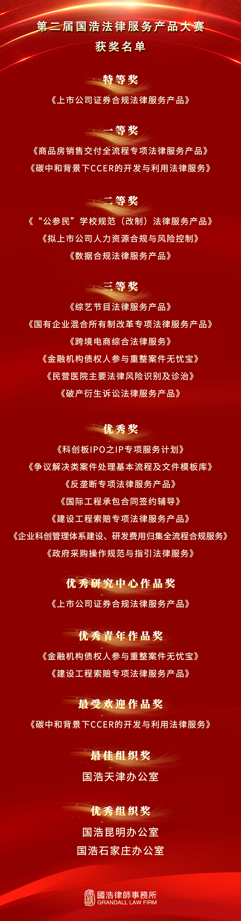 經過現場激烈的比拼與角逐,2022年國浩法律服務產品大賽獲獎名單揭曉如下: