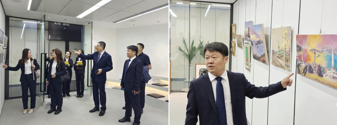 田永偉副會長一行在張旭濤主任的帶領下參觀了國浩大連正在舉辦的“家國情懷——慶國慶、喜迎二十大”李平、劉慶帥美術作品展。田永偉副會長對大連本土畫家的優秀畫作頗感興趣,并表示自己平時也愛好書法和繪畫,通過此次畫展,直觀感受到了國浩大連優秀的文化建設水平。