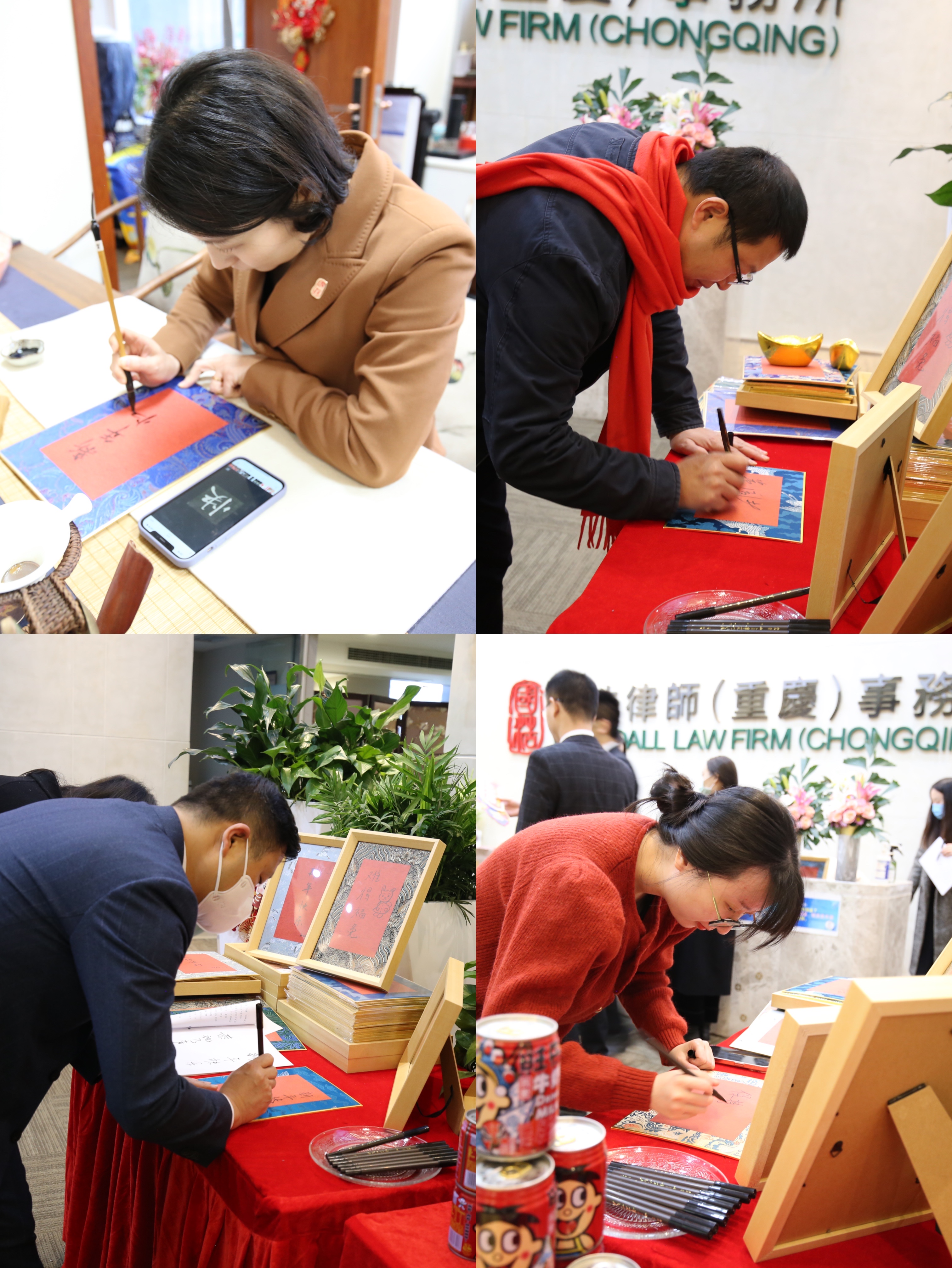 整齊擺放的特制相框,復(fù)古感滿滿的云錦卡紙,為“國浩重慶新春秀場”增添了一抹古典韻味。在“寫祝福”環(huán)節(jié),國浩重慶人有著自己的表達方式——大家揮毫?xí)硶环篮玫男履曜8\S然紙上,再通過盲選抽簽方式,隨機收獲小伙伴們的美好祝福。這樣的形式有著印刷版無法傳達的情感溫度,更是屬于“國浩重慶人”的獨家記憶。