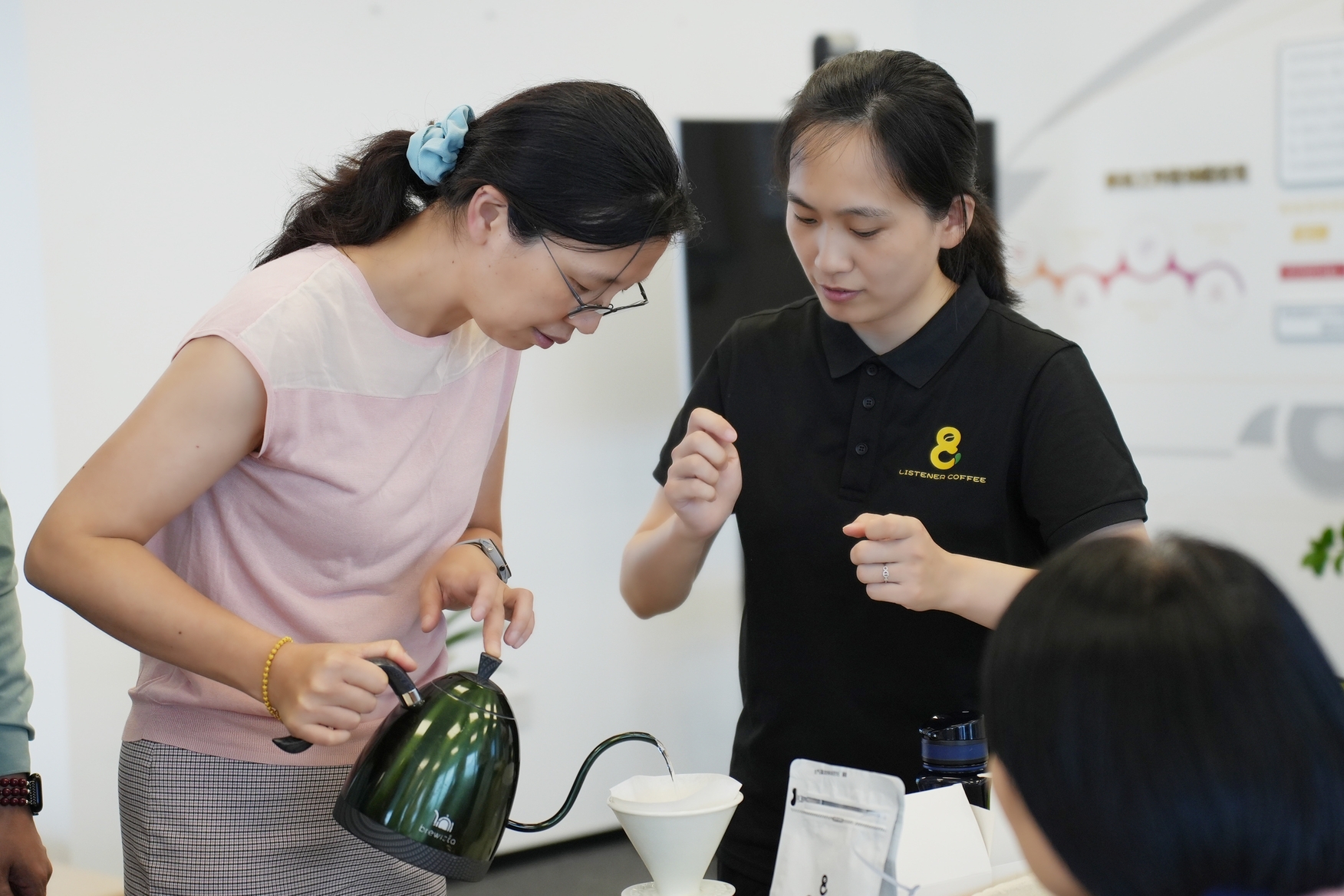 活動特邀蘇州助殘就業公益項目“聆聽咖啡”團隊為大家帶來一場沉浸式的咖啡文化之旅。“聆聽咖啡”的專業老師娓娓道來咖啡的起源、品類與品鑒知識,引領大家步入咖啡世界的馥郁殿堂。隨后的實踐環節更是精彩紛呈,從掌握手沖咖啡的精準水溫、注水手法與萃取時間的藝術,到體驗咖啡拉花時奶泡與濃縮咖啡的浪漫邂逅,大家興致盎然地動手嘗試,在咖啡氤氳的香氣中感受專注與創造的樂趣,工作的壓力在歡聲笑語中悄然釋放。