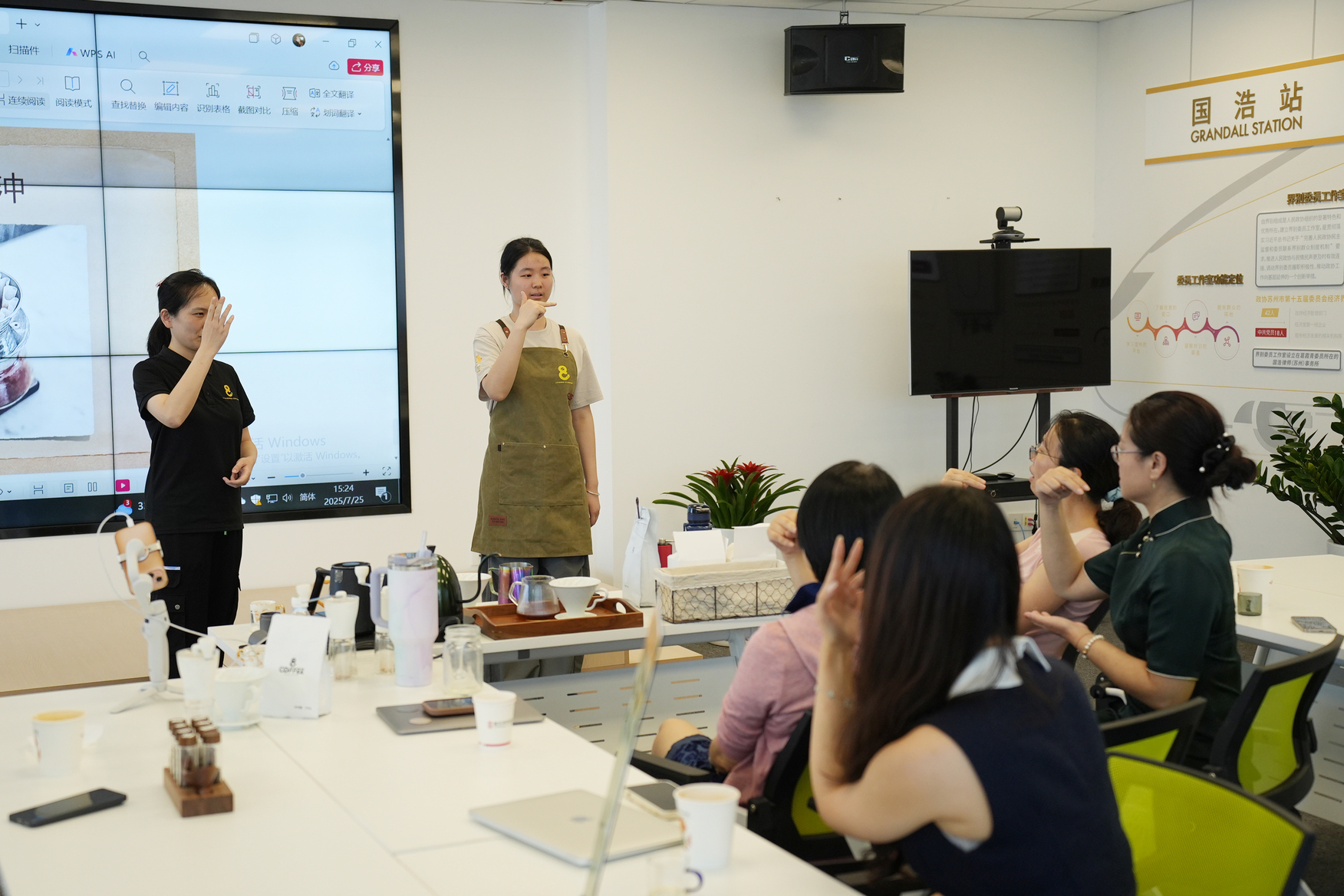 尤為觸動人心的是“用手語點咖啡”的教學環節,在手語老師的耐心教導下,大家認真學習如何通過手語表達“一杯拿鐵”“謝謝”等日常用語,在無聲的交流中感受到溝通的另一種溫度與力量。