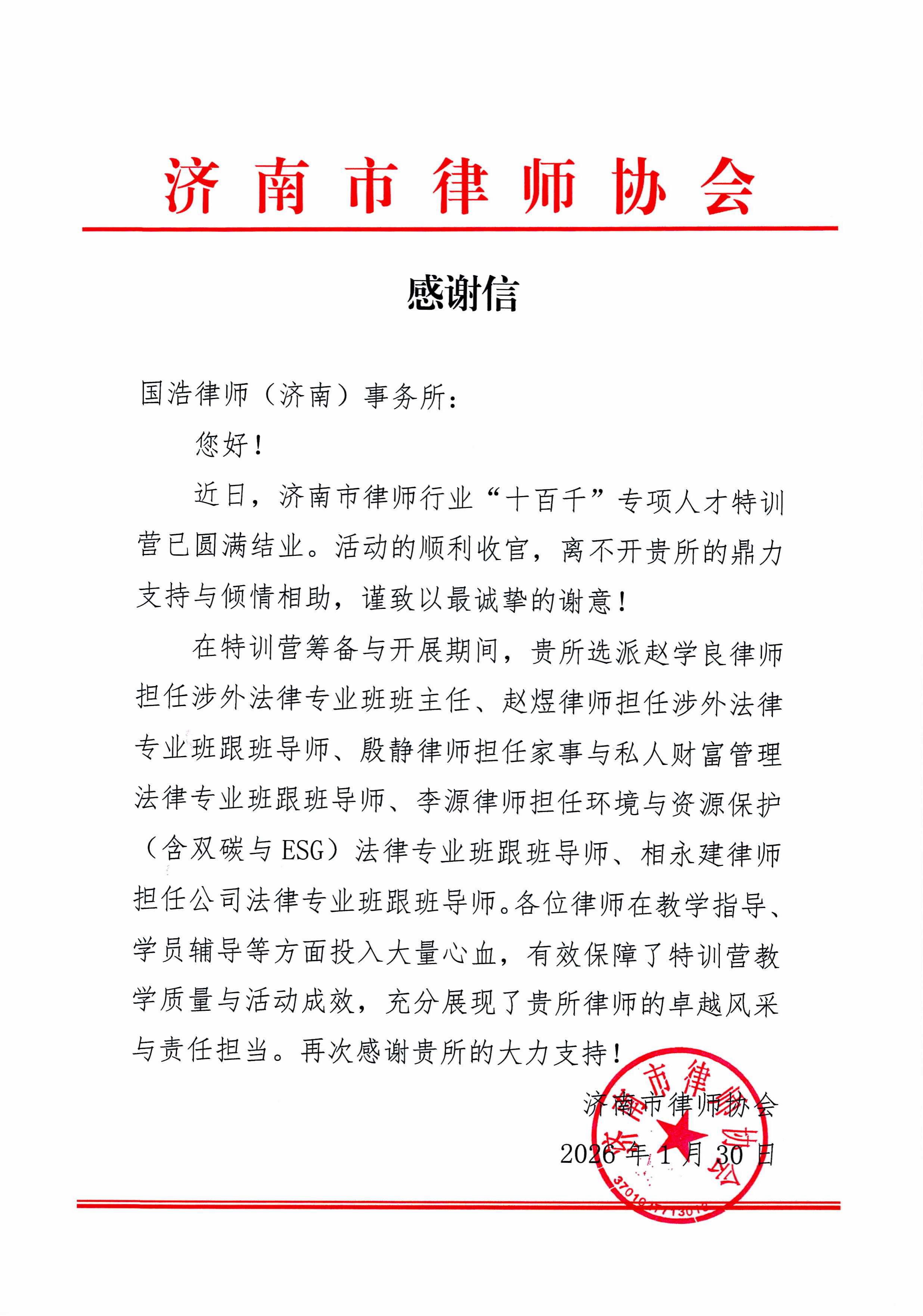 專業人才是行業發展的基石,法治建設離不開薪火相傳的培育之力。近日,國浩濟南收到濟南市律師協會發來的感謝信,信中對其在濟南市律師行業 “十百千” 專項人才特訓營中的鼎力支持和傾力相助予以高度肯定,并致以誠摯謝意。