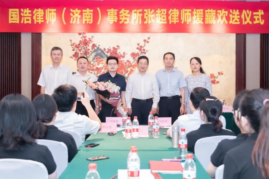 2020年8月1日,國浩濟南辦公室舉辦了張超律師援藏歡送儀式。山東省律師協會會長王民生,濟南市司法局律師工作處負責人盛連武,濟南市律師協會會長耿國玉,濟南市司法局律師工作處副處長傅娟,國浩濟南管理合伙人、主任鄭繼法,管理合伙人付勝濤、吳蒙、安樹軍、劉建鑫等律師出席。