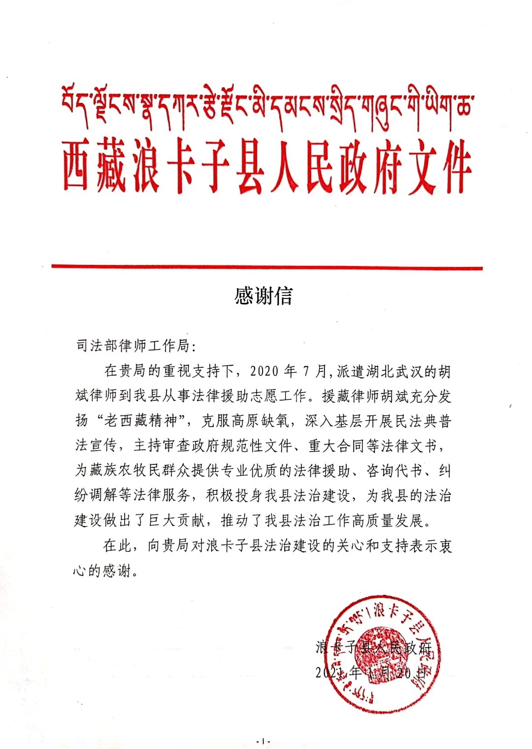 胡斌律師于2021年1月20日獲浪卡子縣人民政府感謝信