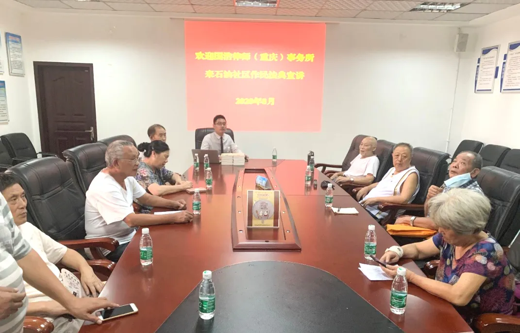 8月24日,國浩重慶律師李代銀走進(jìn)國浩重慶辦公室簽訂結(jié)對服務(wù)的大石壩街道石油社區(qū),為當(dāng)?shù)鼐用耖_展了一場民法典專題公益講座,為社區(qū)居民送去100冊《民法典總則編》和10箱夏日解暑礦泉飲用水。重慶江北區(qū)大慶村石油社區(qū)書記左濤、江北區(qū)大石壩司法所科長胡長明、社區(qū)居民、離退休老干部等20余人參加了現(xiàn)場學(xué)習(xí)。