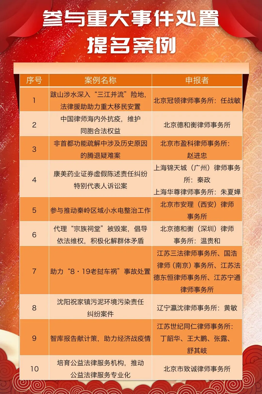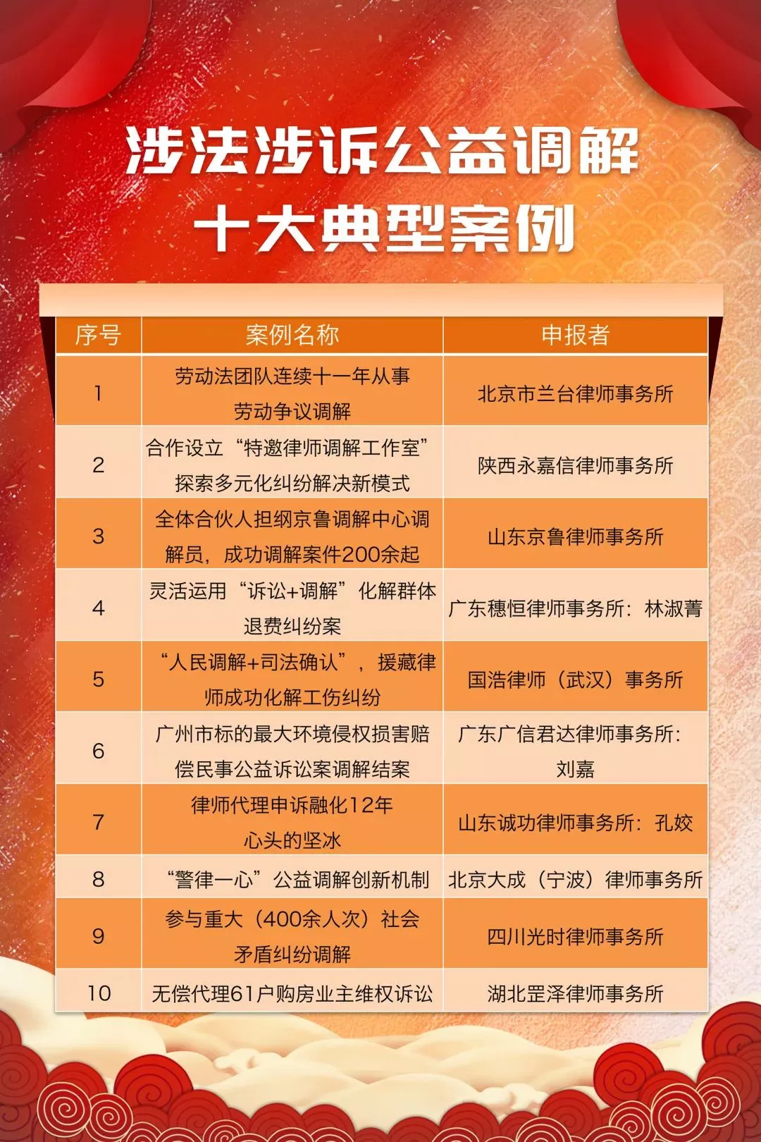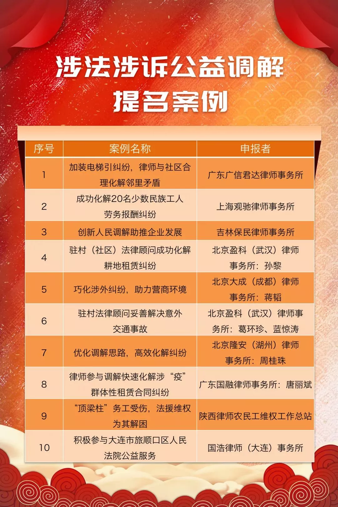 2022年1月26日,法治日報社聯合中國政法大學律師學研究中心面向全國開展的“首屆律師公益(社會責任)典型案例”征集宣傳活動重磅揭曉。國浩5個公益項目入選“參與重大事件處置提名案例”、“法律援助十大典型案例”、“搶險救災抗疫十大典型案例”、“涉法涉訴公益調解十大典型案例”、“涉法涉訴公益調解提名案例”。