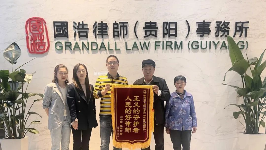 “正義的守護(hù)者、人民的好律師。”2022年4月25日下午,兩位老人提著一面錦旗來到國浩貴陽辦公室,飽含深情地對國浩貴陽合伙人楊波和律師潘艷、楊穎說:“我們老兩口特意過來送你們一面錦旗,這個(gè)一定要收下,感謝你們。”