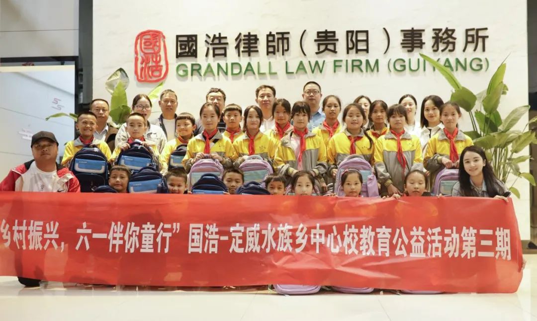 國浩律師事務所始終關注并踐行社會責任,設立了國浩公益基金,自2019年起每年出資2萬元助力定威鄉中心校教育公益,并于2021年起結合鄉村振興持續開展教育公益活動讓孩子們走出榕江。國浩貴陽辦公室自2017年6月參與貴州省司法廳、省律師協會開展的“法律援助精準扶貧項目”以來,成為了黔東南州榕江縣定威水族鄉精準扶貧定向服務聯系點,積極落實“法律扶貧專項行動”安排部署,主動作為,創造性開展精準扶貧工作。