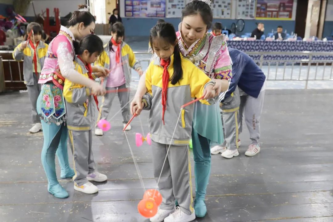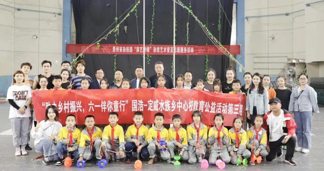 貴州省雜技團有限公司黨支部副書記、副董事長齊寧,副總經理韋宇參與了本次活動,并對定威水族鄉中心校師生的到來表示了熱烈歡迎。貴州省雜技團專門為師生們舉辦了一場專場演出,精彩紛呈的表演引得孩子們驚叫連連,掌聲不斷。演出結束后,雜技團老師們還邀請學校的老師和孩子們上臺體驗雜技器材的使用和技巧的練習,在老師手把手的教學下,孩子們玩得不亦樂乎。