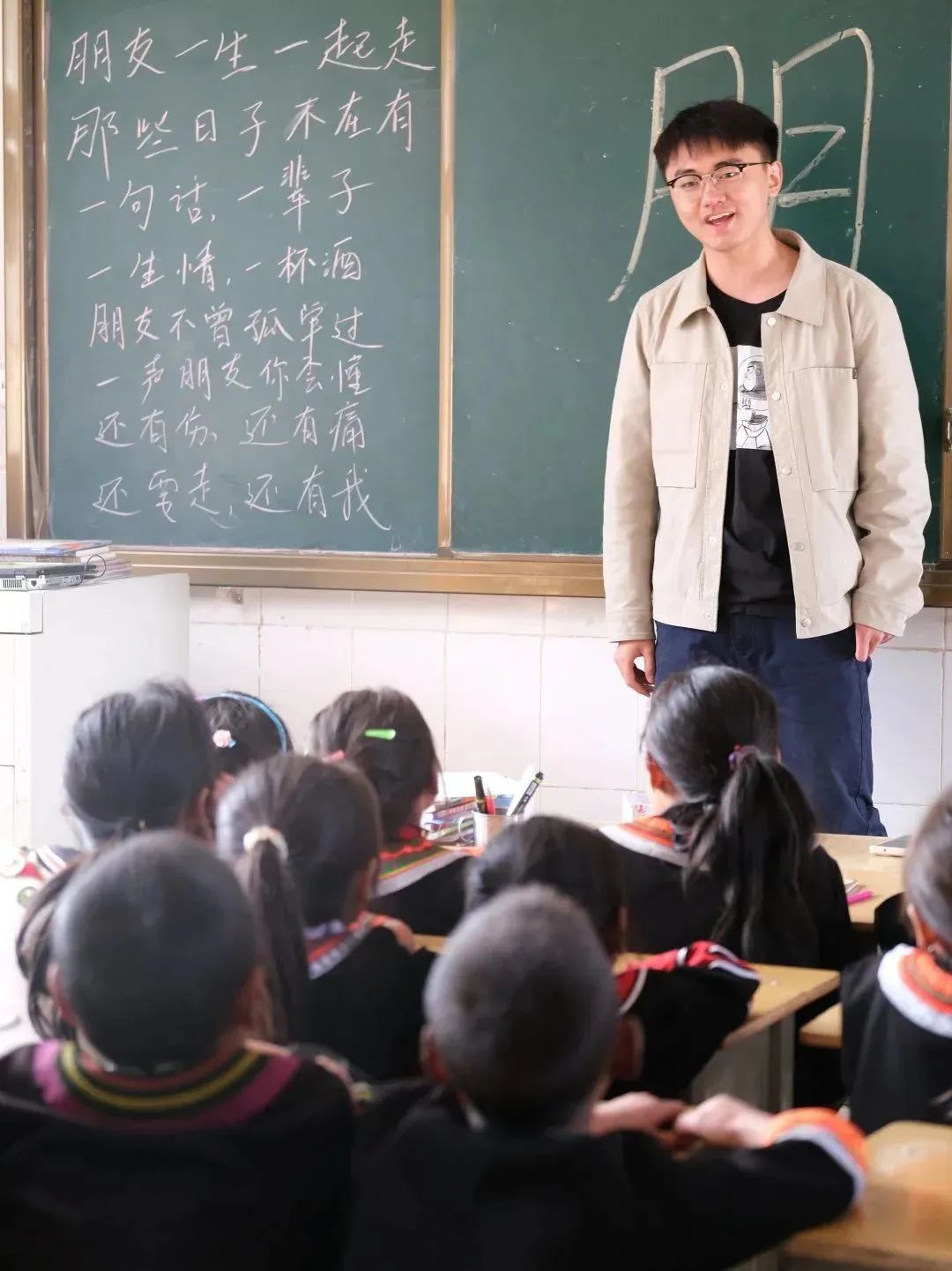 書籍整理完畢,公益委王玉還給小朋友們臨時上了一堂特別的音樂課——教小朋友們唱《朋友》。“朋友一生一起走,那些日子不再有……”在短短四十分鐘的課程里,教小朋友認(rèn)字、教小朋友唱歌,并且與公益委的其他成員們一起完成了大合唱。